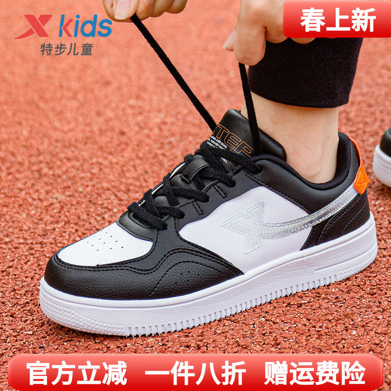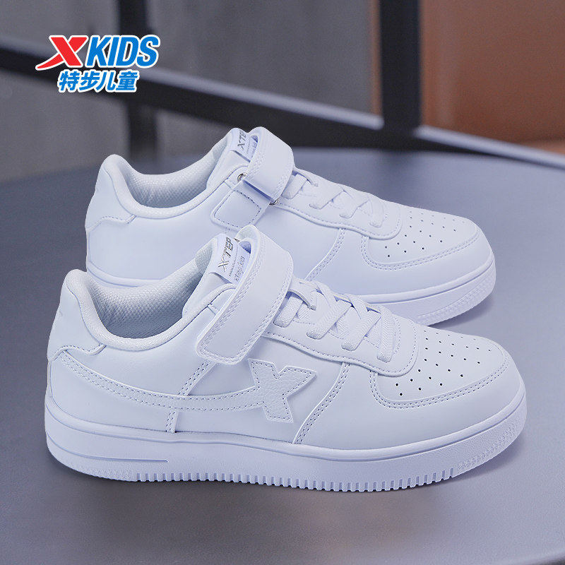 特步童鞋春季白色儿童休闲板鞋学生男童小白鞋皮面防水女童运动鞋