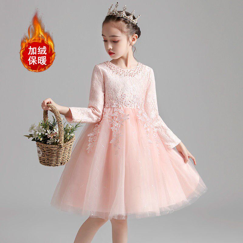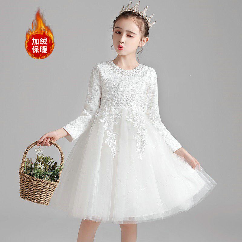 新款女童公主裙礼服秋冬新款x白色长袖蓬蓬连衣裙儿童婚纱小女孩