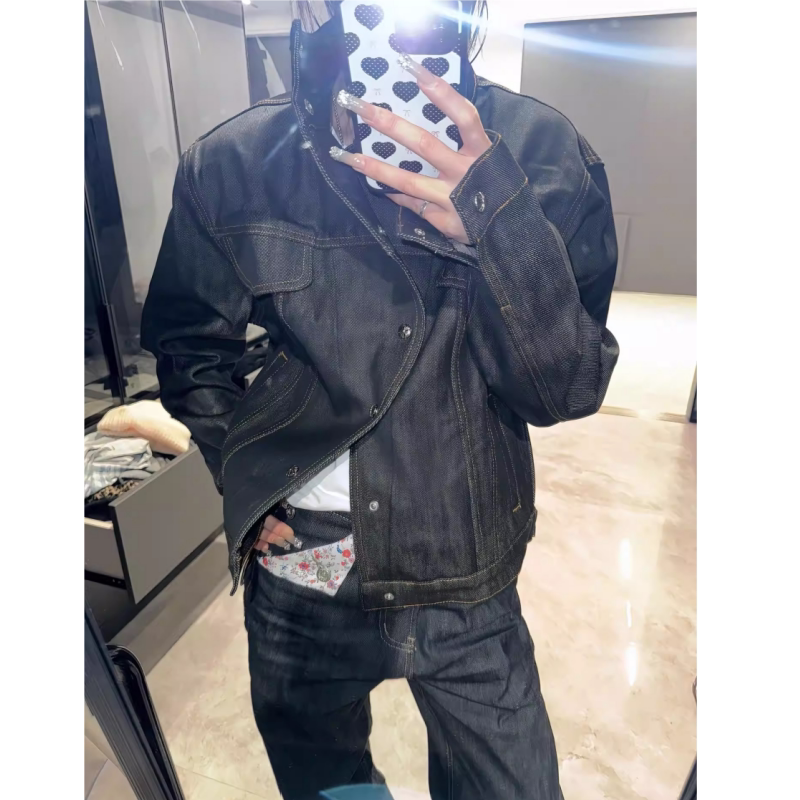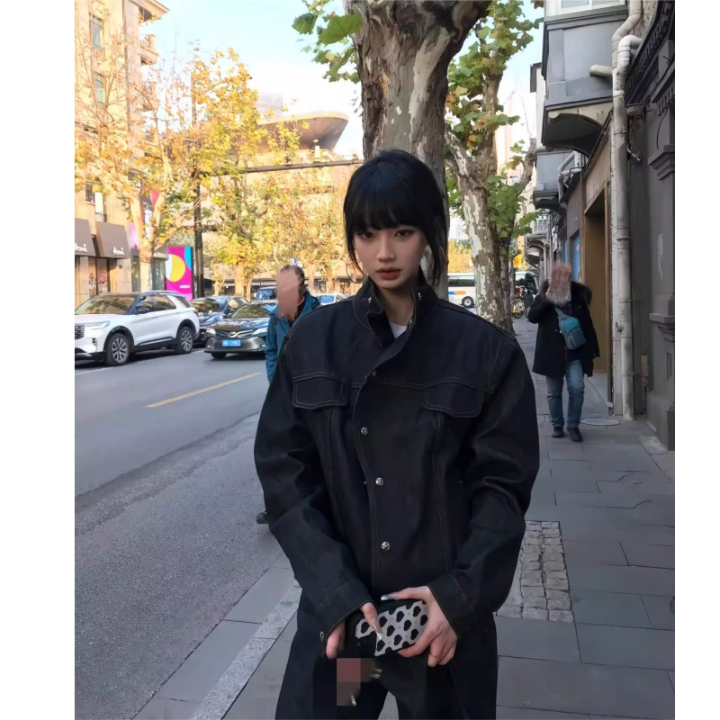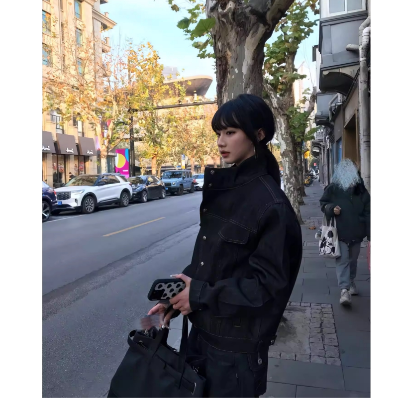 美式原牛黑色立领牛仔外套女款春季高街潮牌复古明线正肩工装夹克