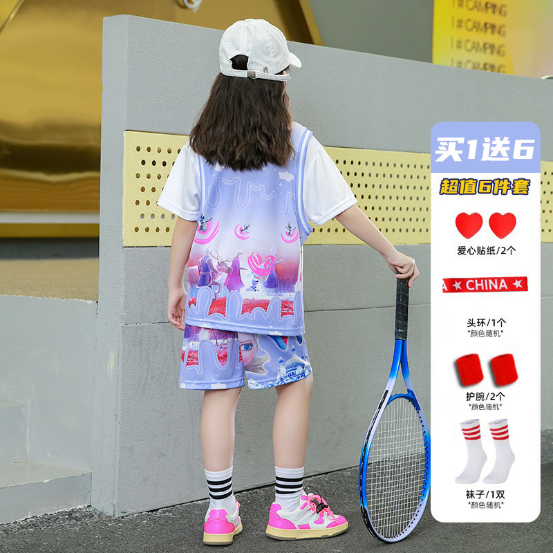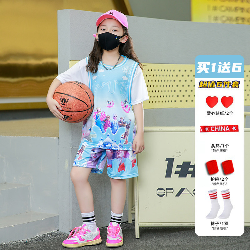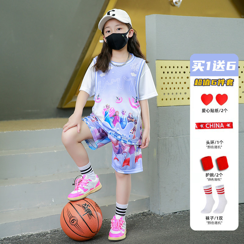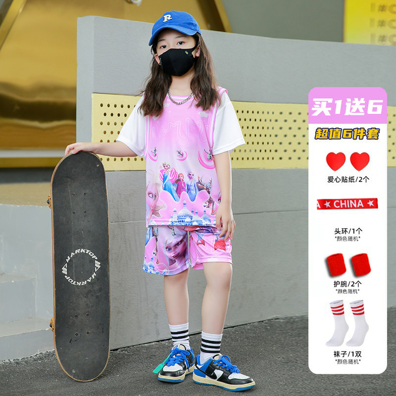 女童粉色篮球服套装女夏季爱莎运动套装儿童宝宝运动速干球衣短袖