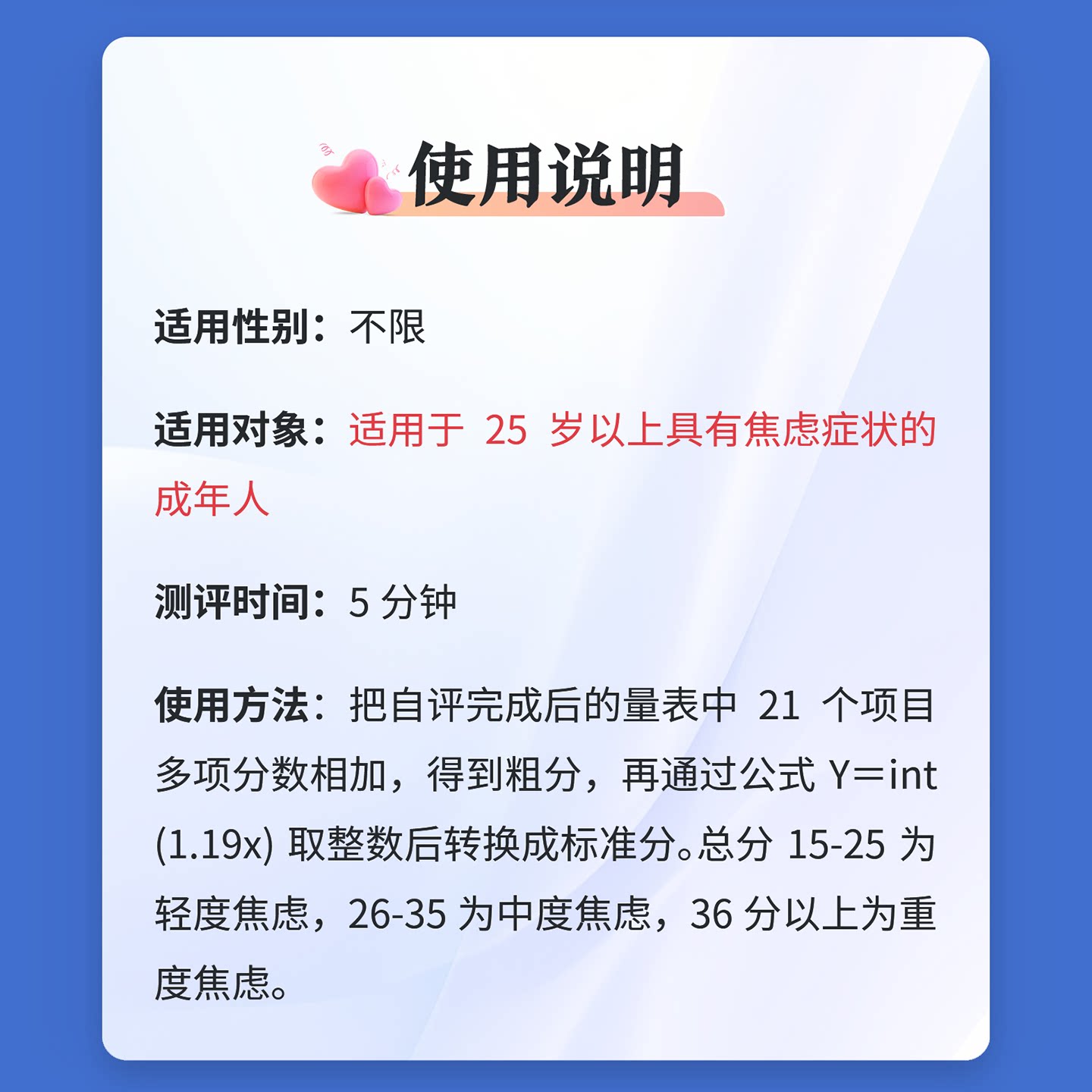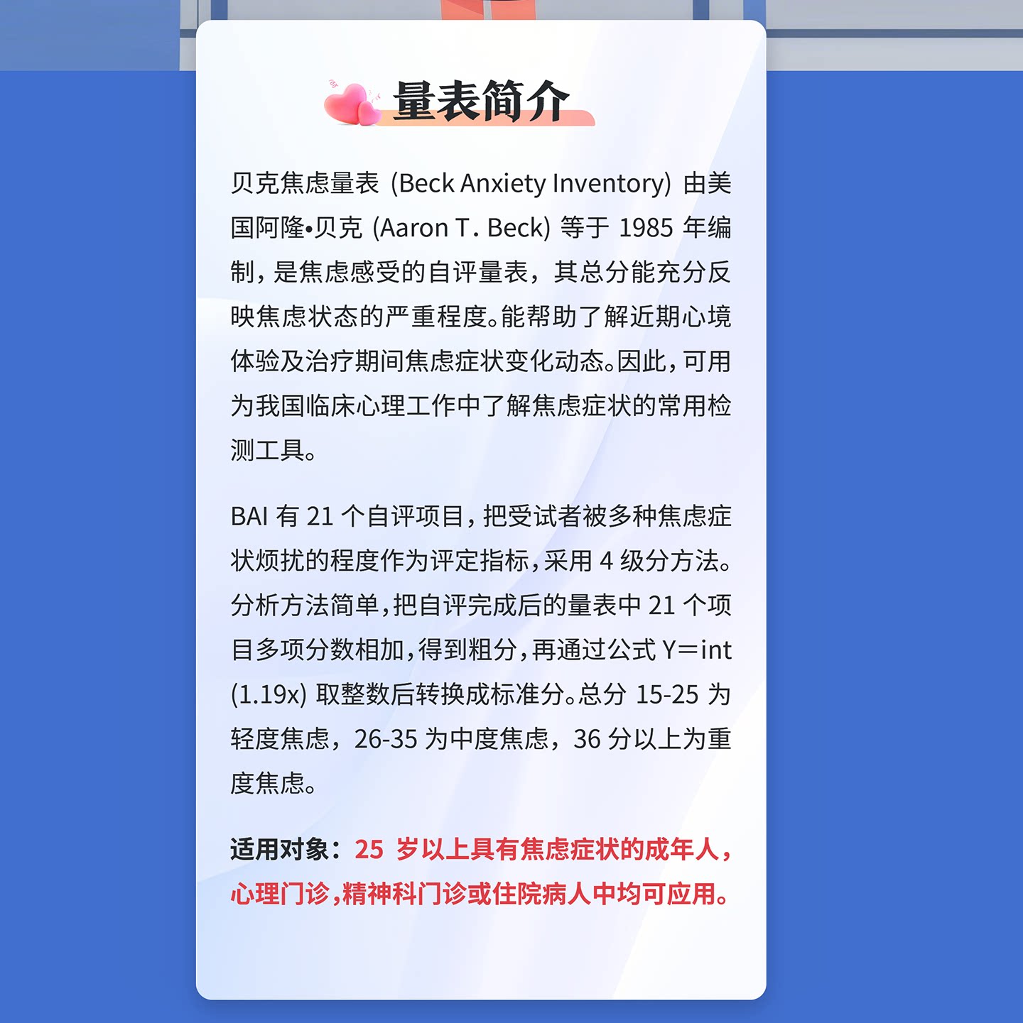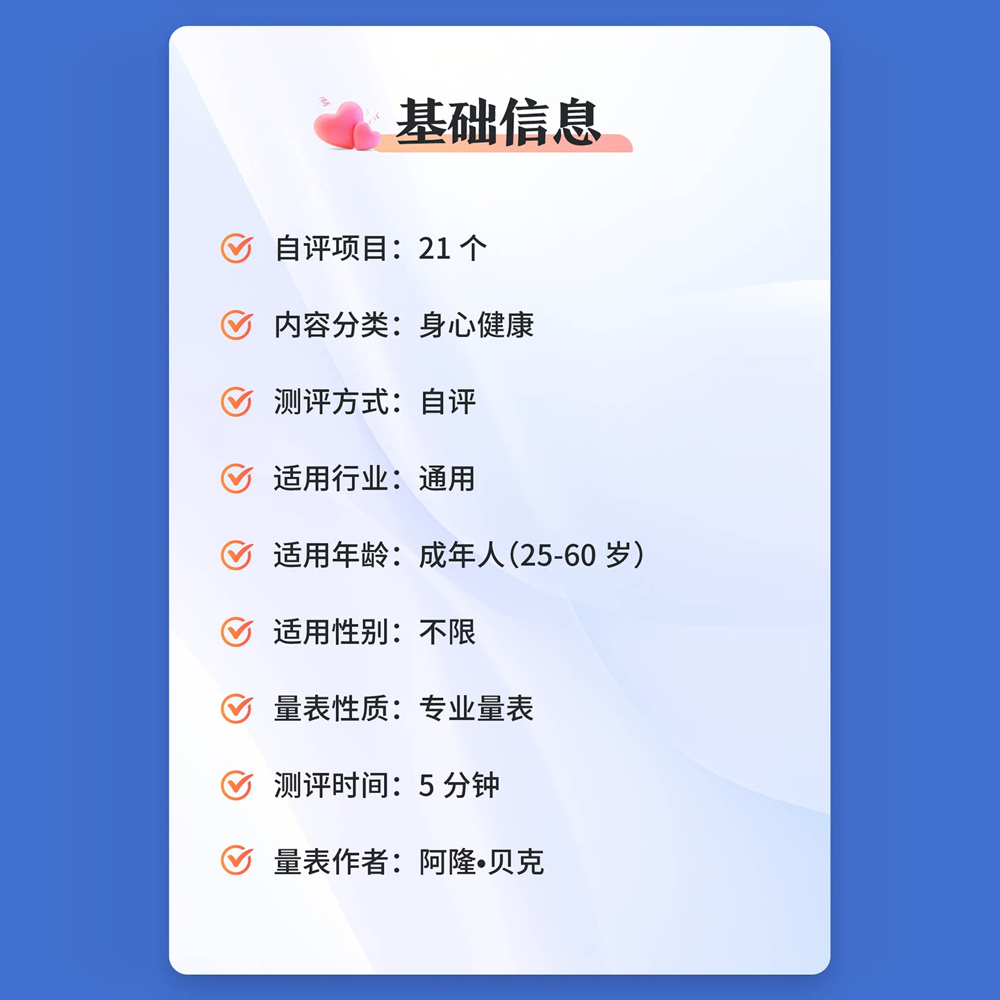 贝克焦虑量表(BAI)心理健康测试焦虑测评团体辅导焦虑情绪筛查表