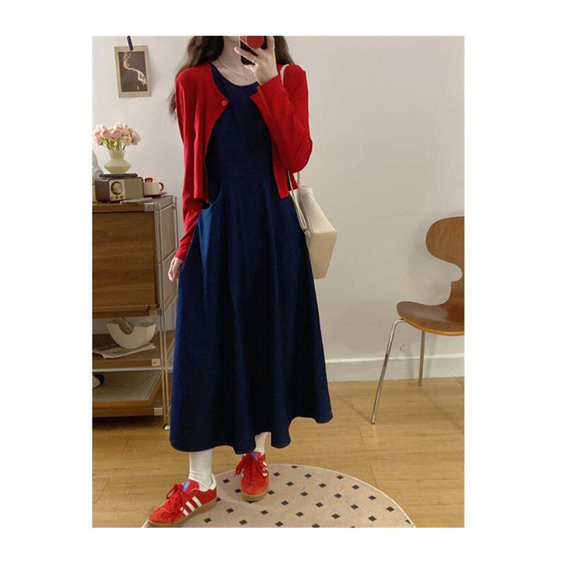 大码胖mm深蓝色牛仔背心收腰连衣裙红色长袖防晒开衫两件套女春季