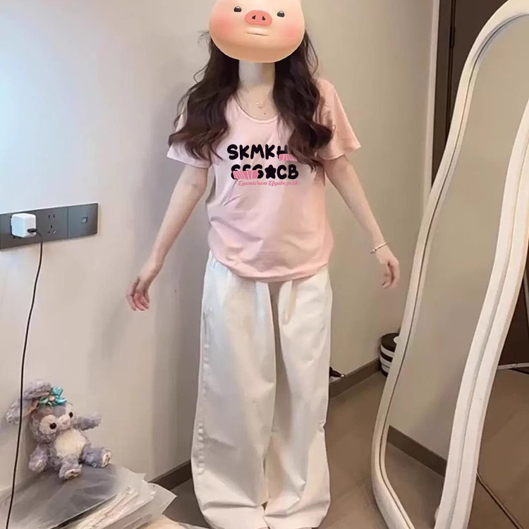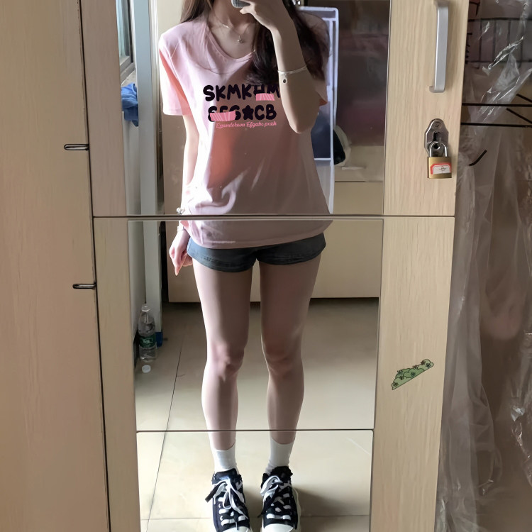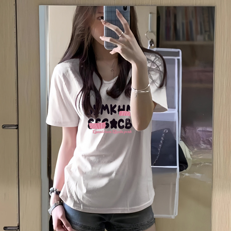 粉色棉正肩V领短袖T恤女款夏季宽松超好看独特漂亮上衣设计感小众