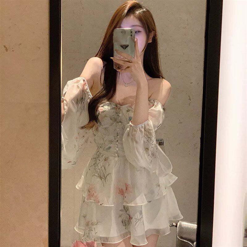 法式一字肩长袖碎花连衣裙女春秋小个子高级感气质收腰仙女蓬蓬裙