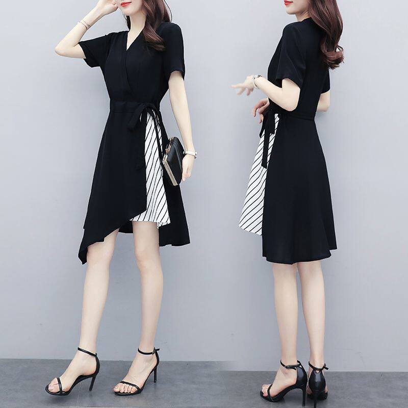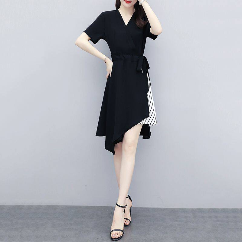大码连衣裙女装2023夏季新款胖mm黑色减龄V领收腰显瘦小个子长裙