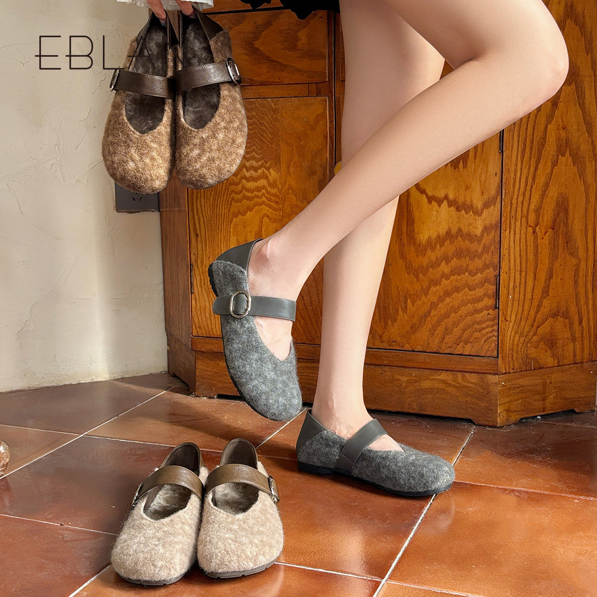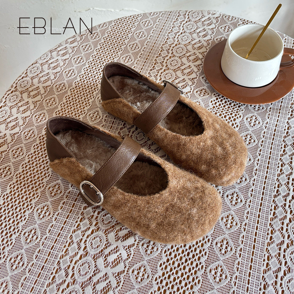 EBLAN/伊伴一字带内增高玛丽珍鞋女2025秋冬新款浅口毛毛软底单鞋