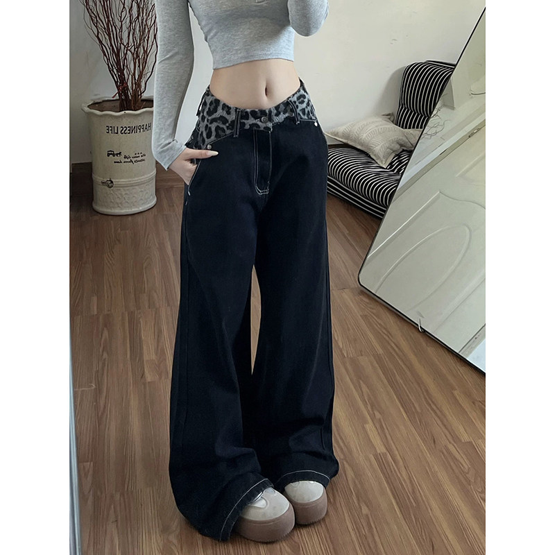 设计感腰头拼接豹纹牛仔裤裤子女款2026春秋新款高腰直筒裤阔腿裤