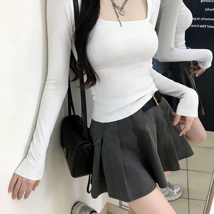辣妹白色u领正肩长袖T恤女春款2026新款女装内搭打底衫紧修身上衣