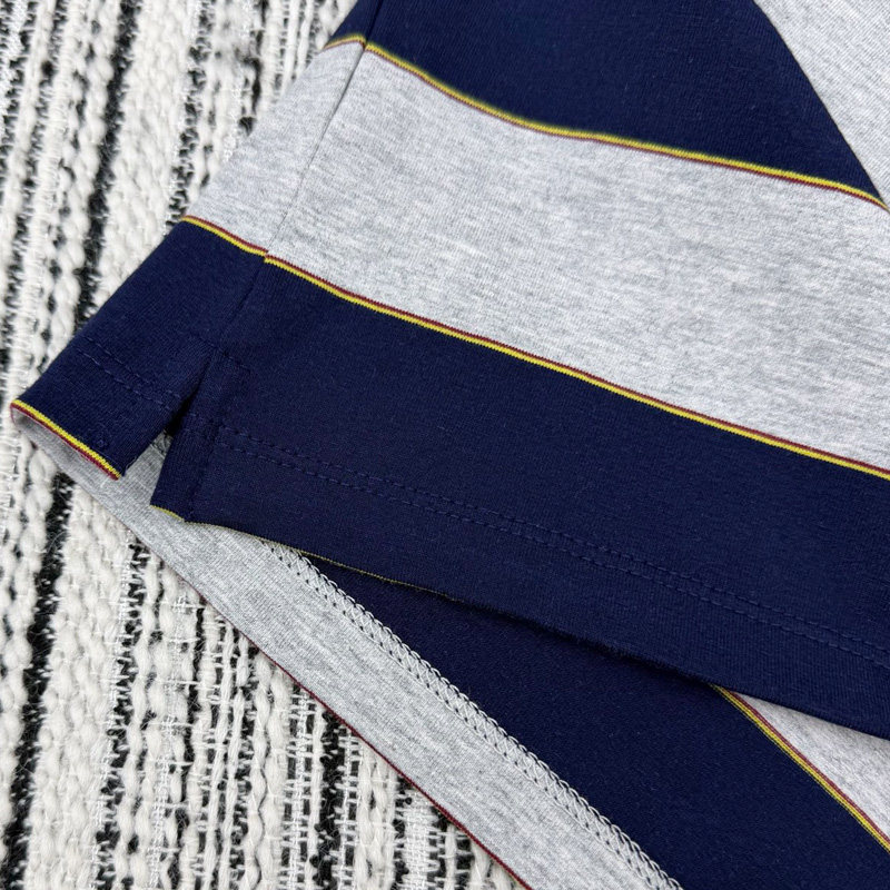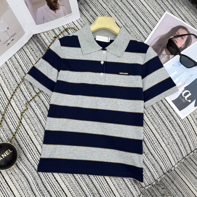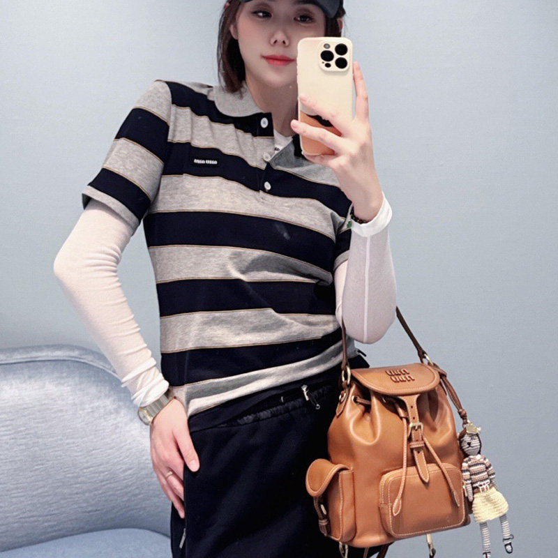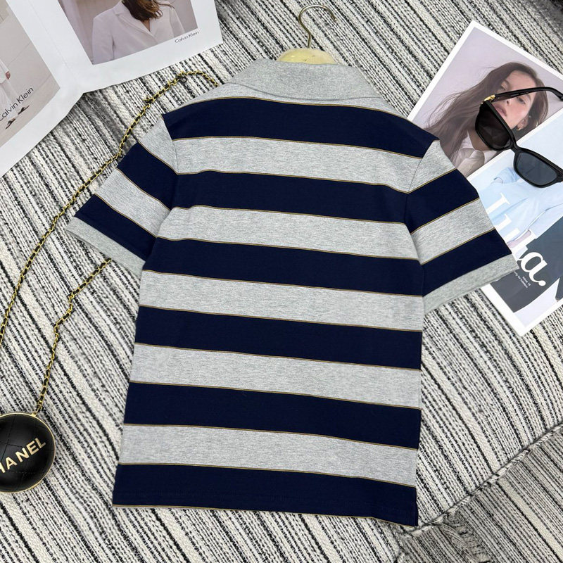 2026早春新款灰蓝色条纹口袋翻领修身时尚短袖POLO衫短袖T恤女棉