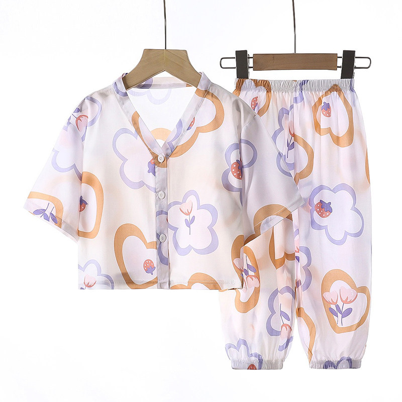 婴儿绵绸衣服男女童短袖长裤空调家居服儿童人造棉睡衣宝宝套装夏