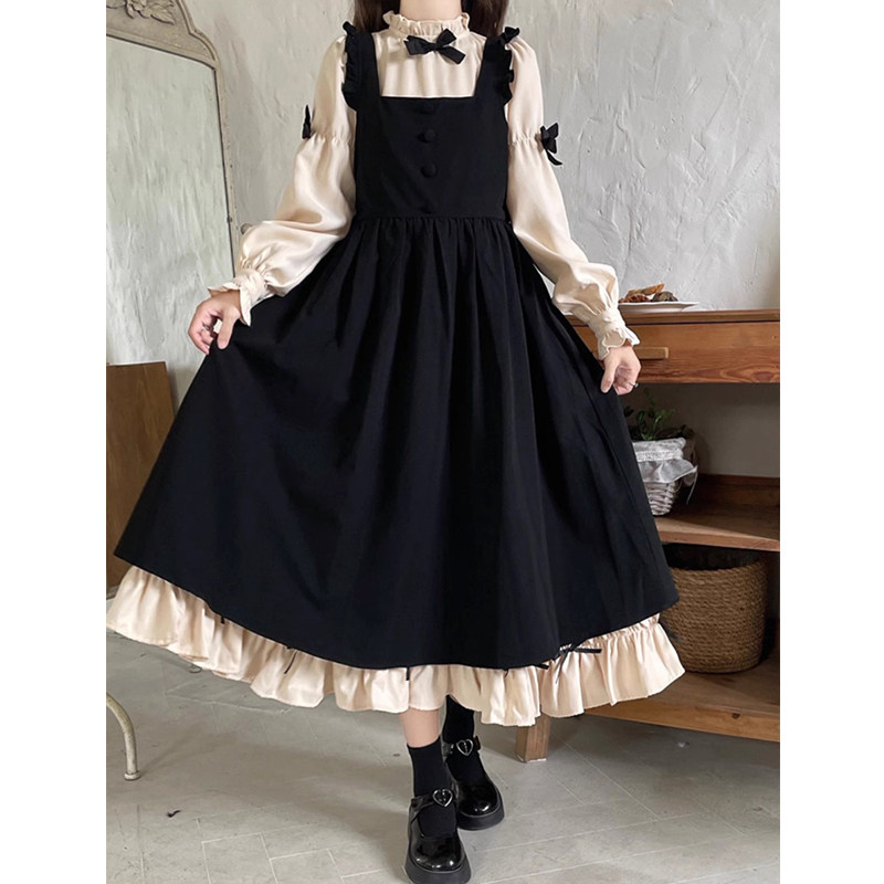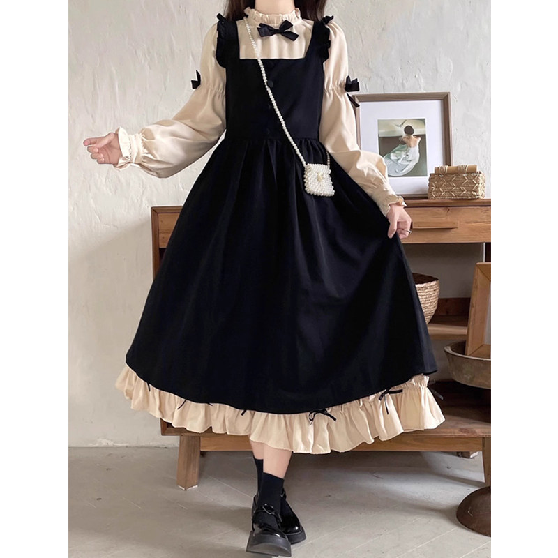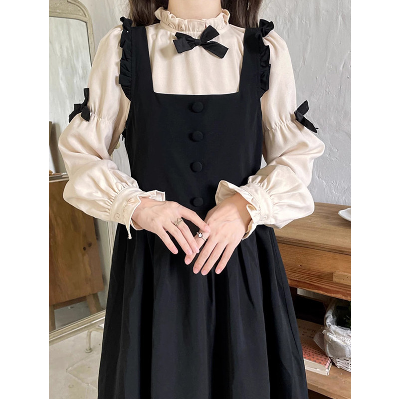 女大童法式蝴蝶结连衣裙秋冬季初中学生日系泡泡袖背带假两件裙子