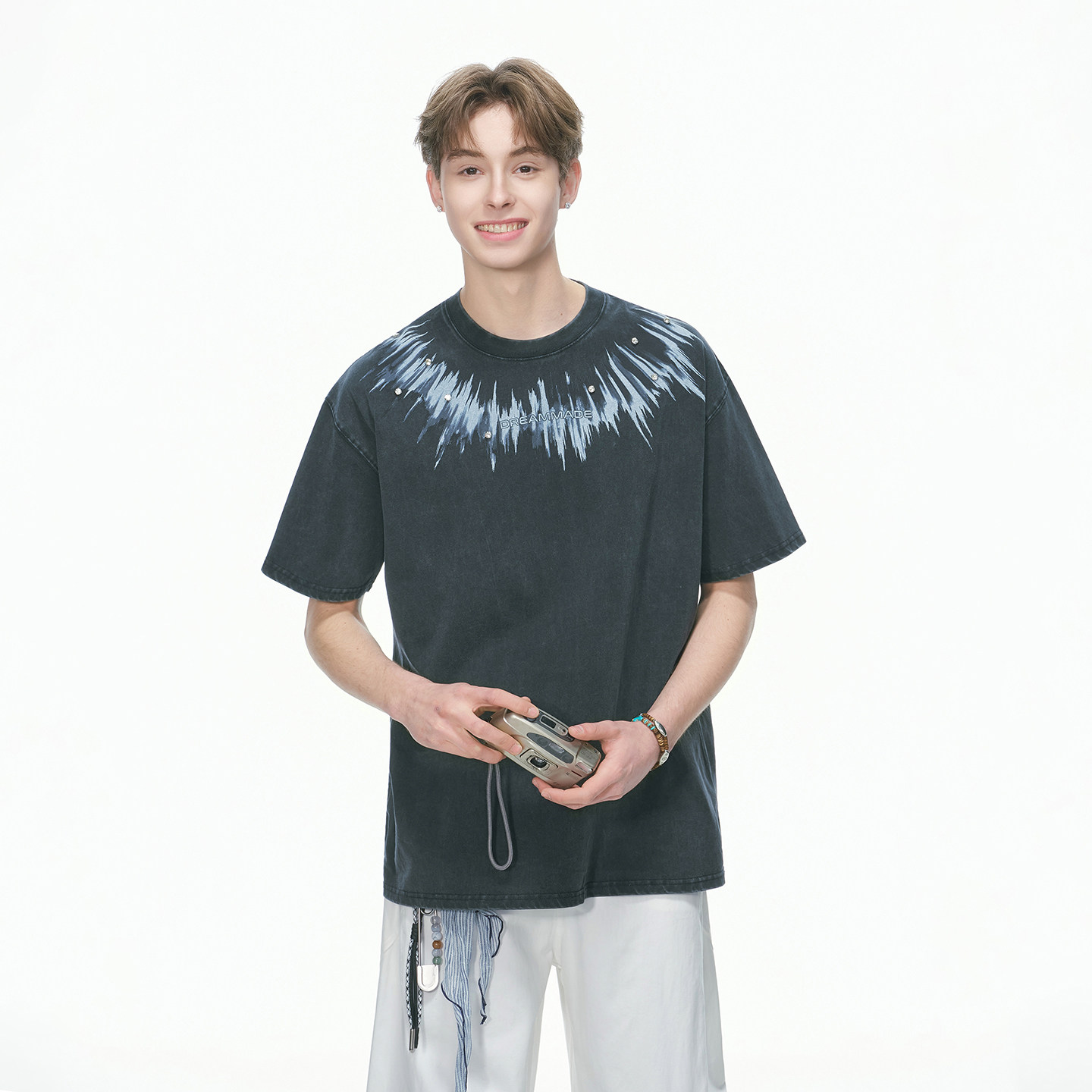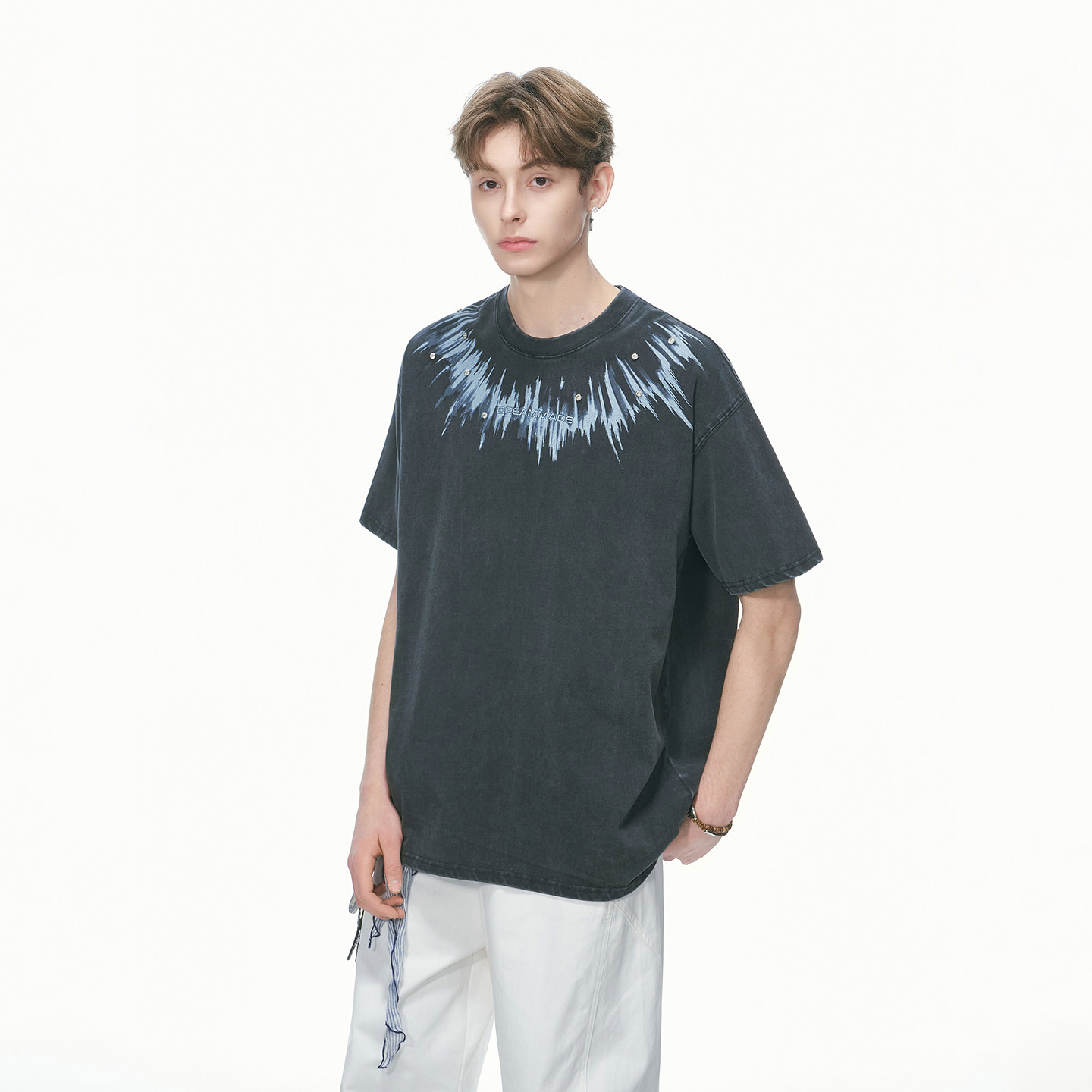 Dream made 美式钉钻水洗短袖T恤男款夏季复古重磅纯棉半袖上衣服