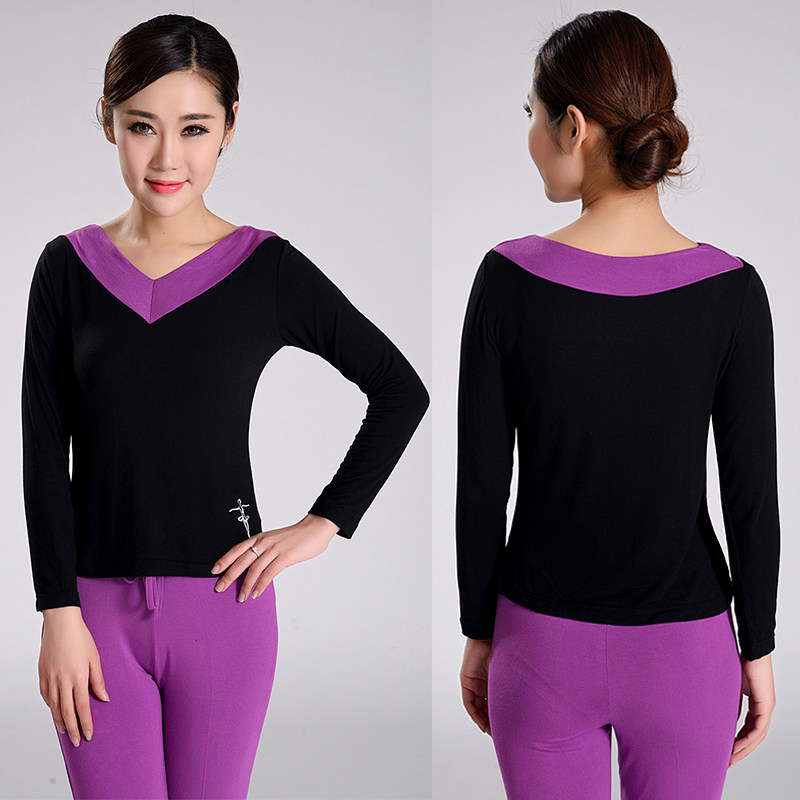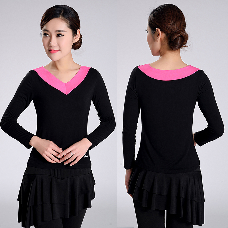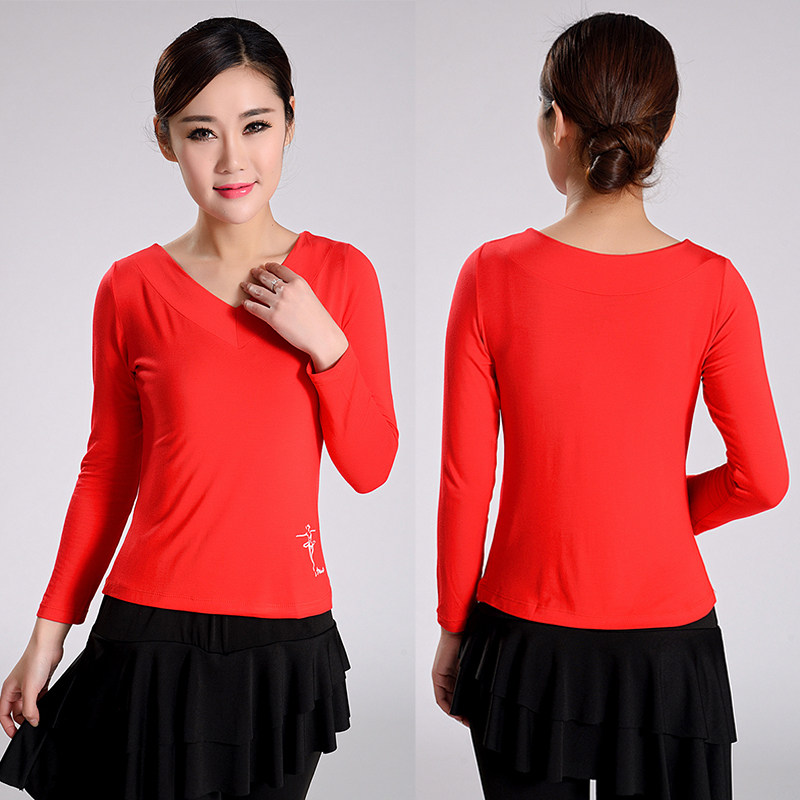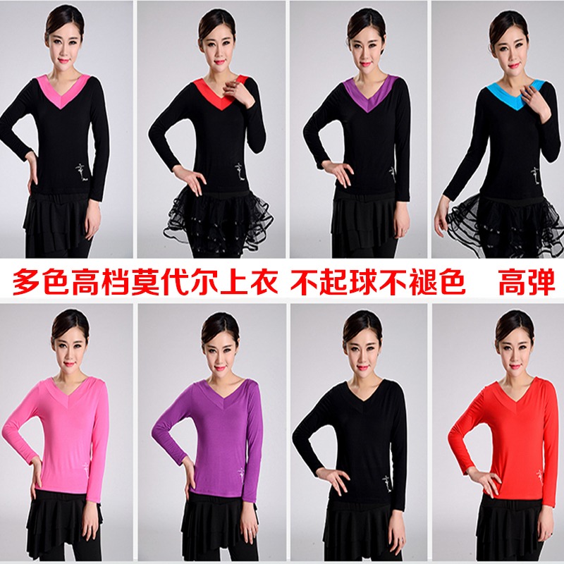 广场舞服装上衣莫代尔新款春夏V领长袖拉丁舞蹈服装成人练功服女