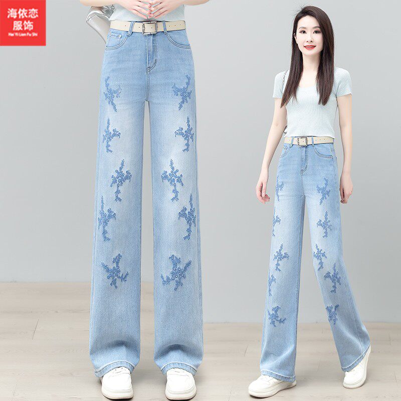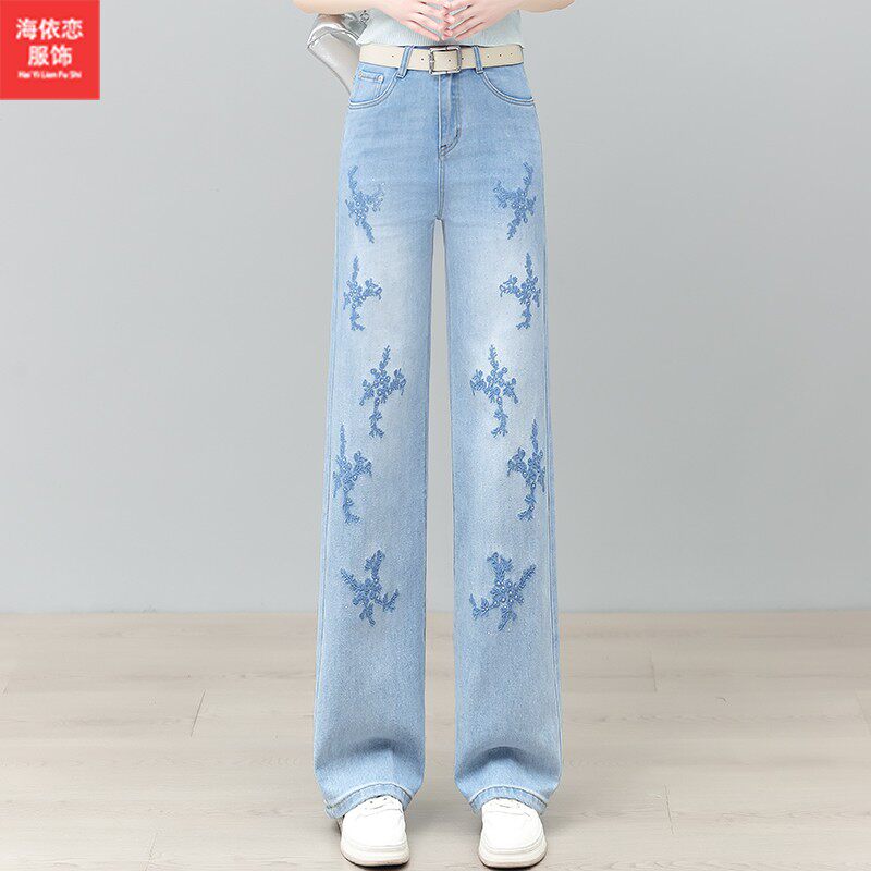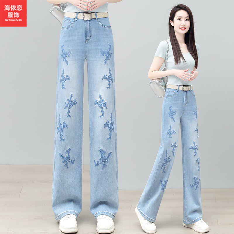 浅蓝色时尚烫钻刺绣直筒牛仔裤女2026新款夏季薄款窄版显瘦阔腿裤