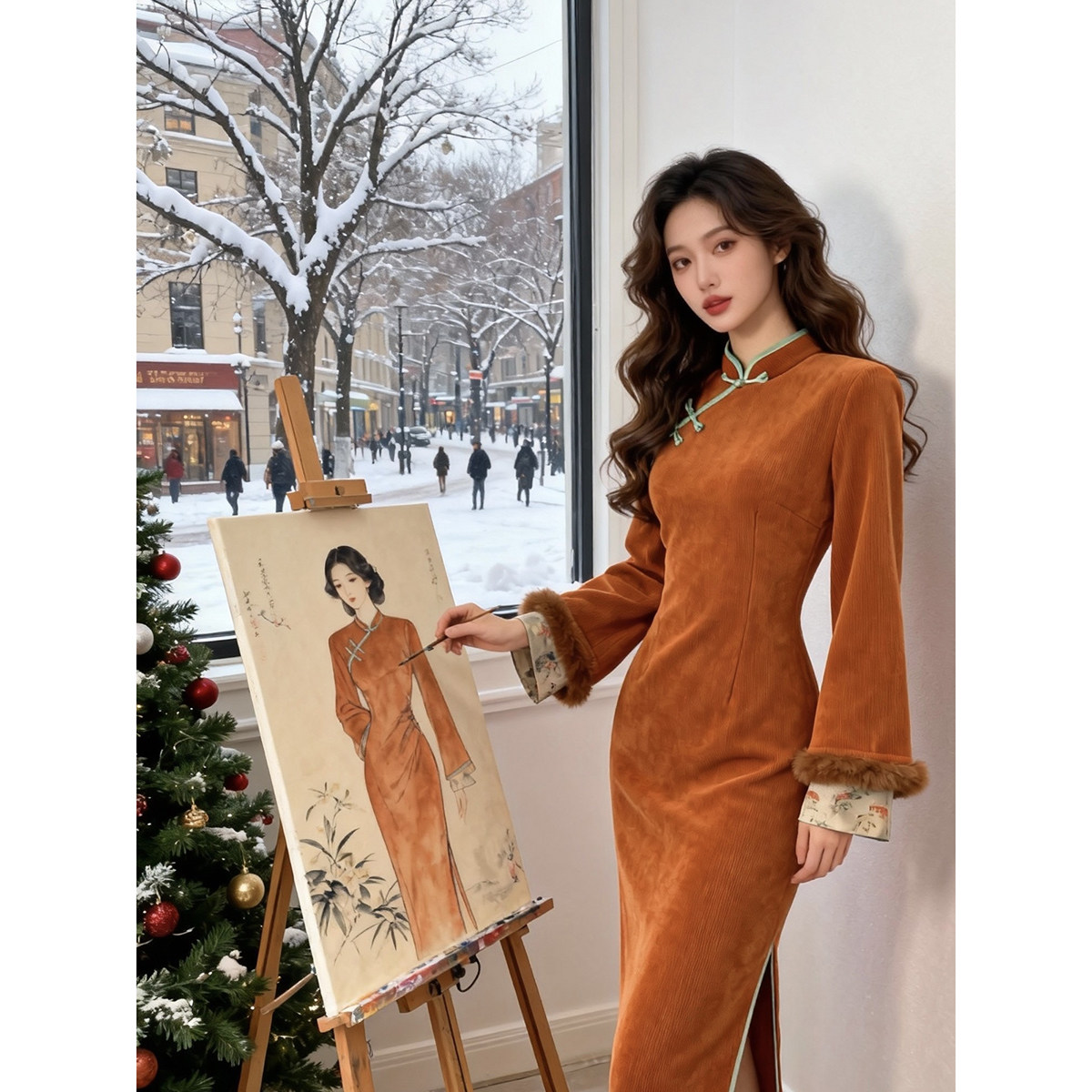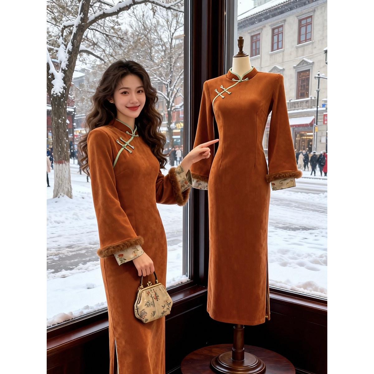 冬季旗袍加绒加厚小个子新中式改良国风倒大袖年轻款连衣裙女气质