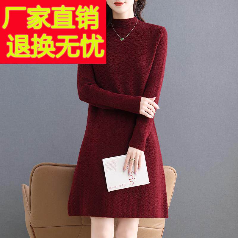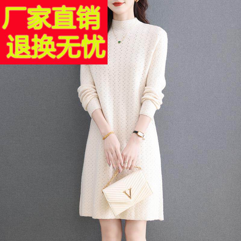 2025秋冬新款小个子中长款半高领内搭白色打底毛衣裙女针织连衣裙