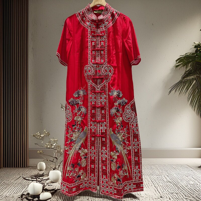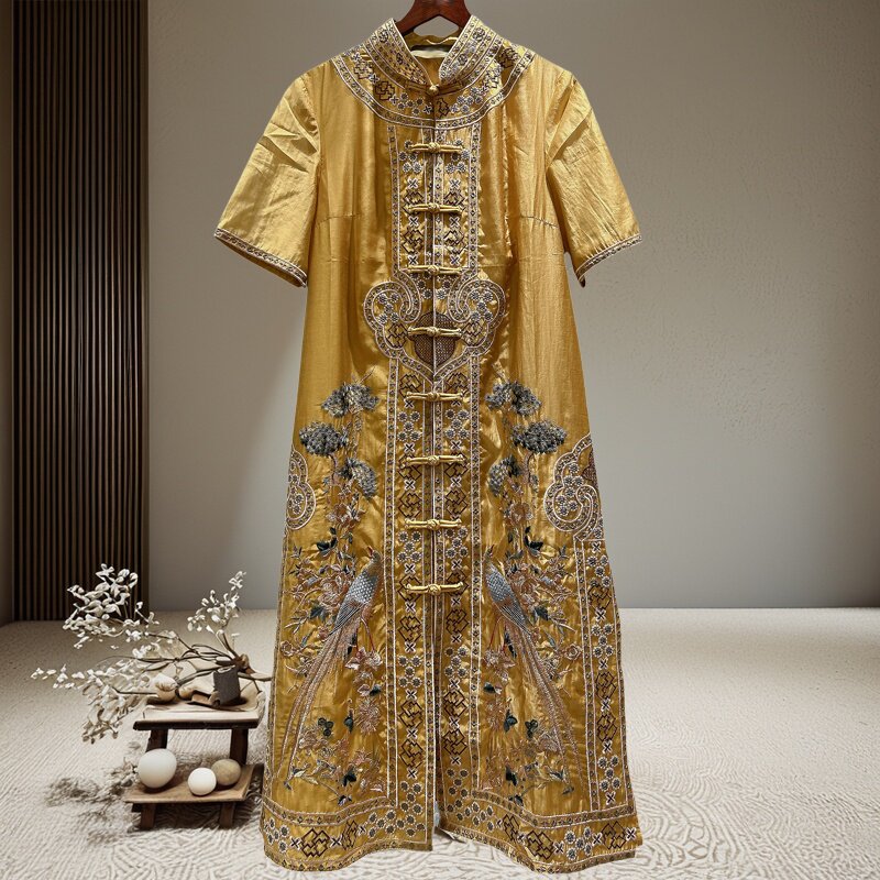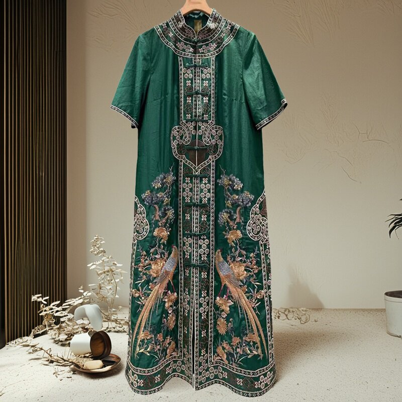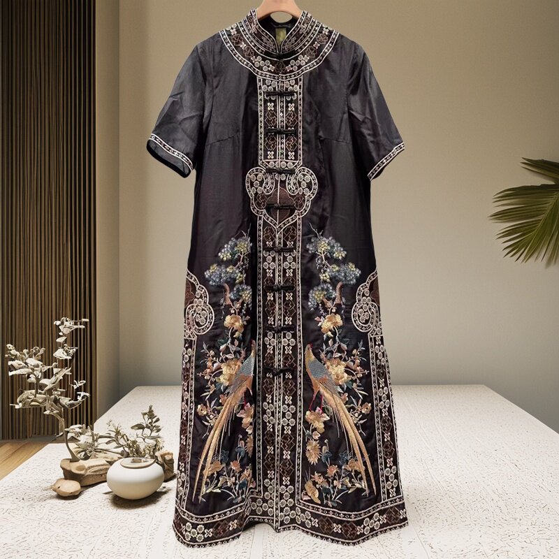 新中式连衣裙夏大码安娜滕国风刺绣花鸟民族风盘扣改良旗袍中长裙