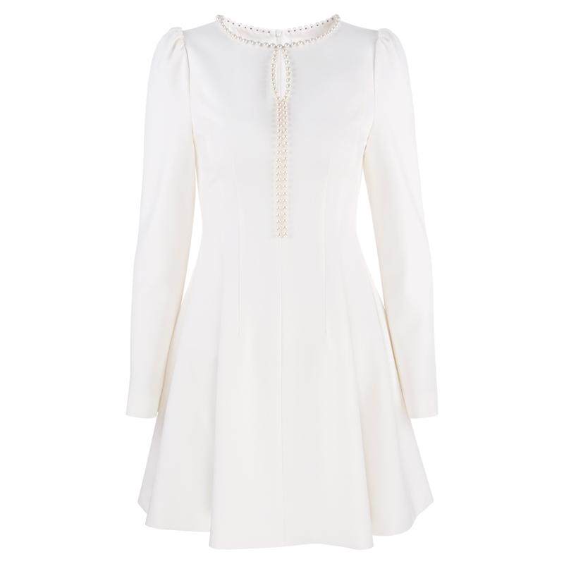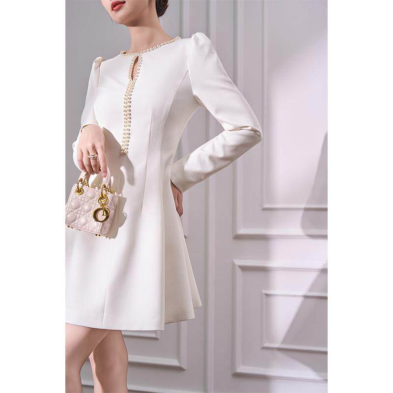 韩语琳 白色长袖收腰连衣裙2024新款女秋冬法式气质短款a字裙裙子