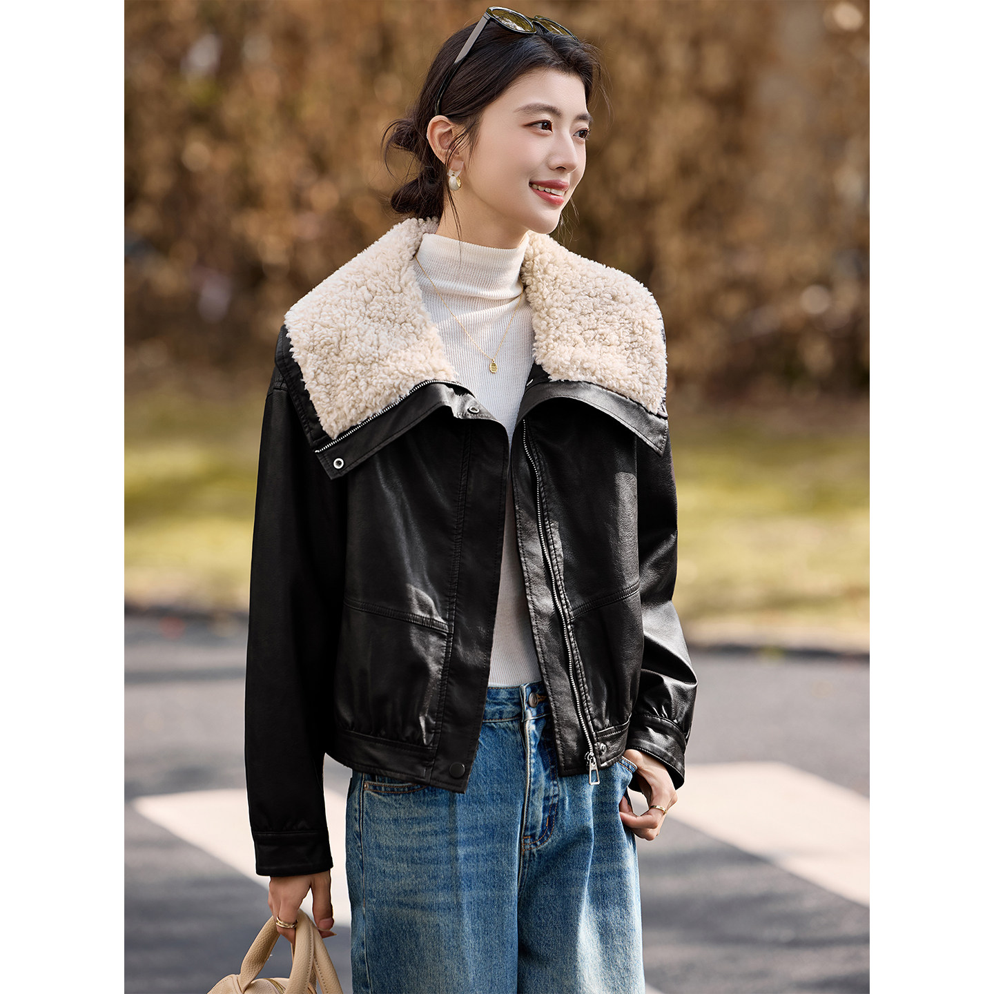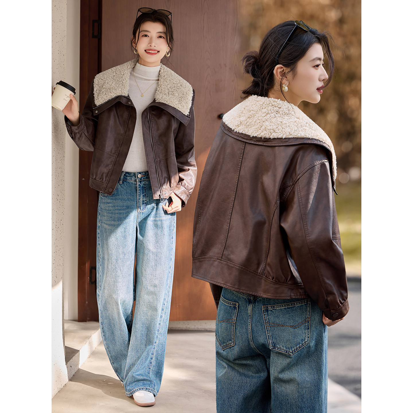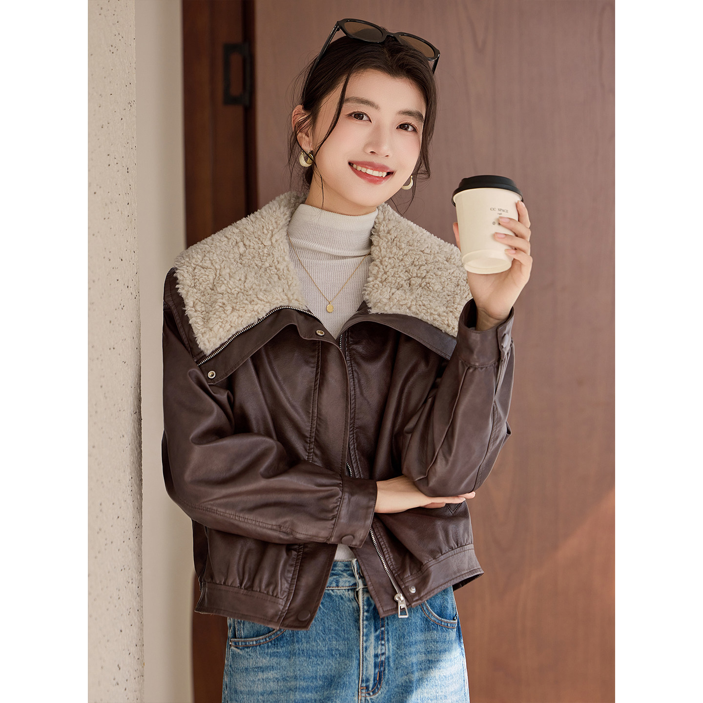 高级感咖色大翻领夹棉皮衣女款2025新款酷飒风机车服加绒夹克外套