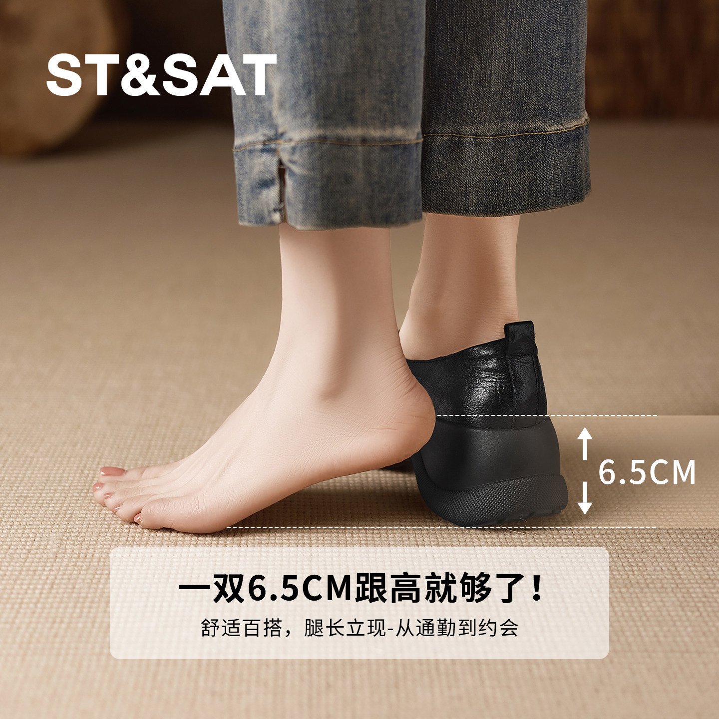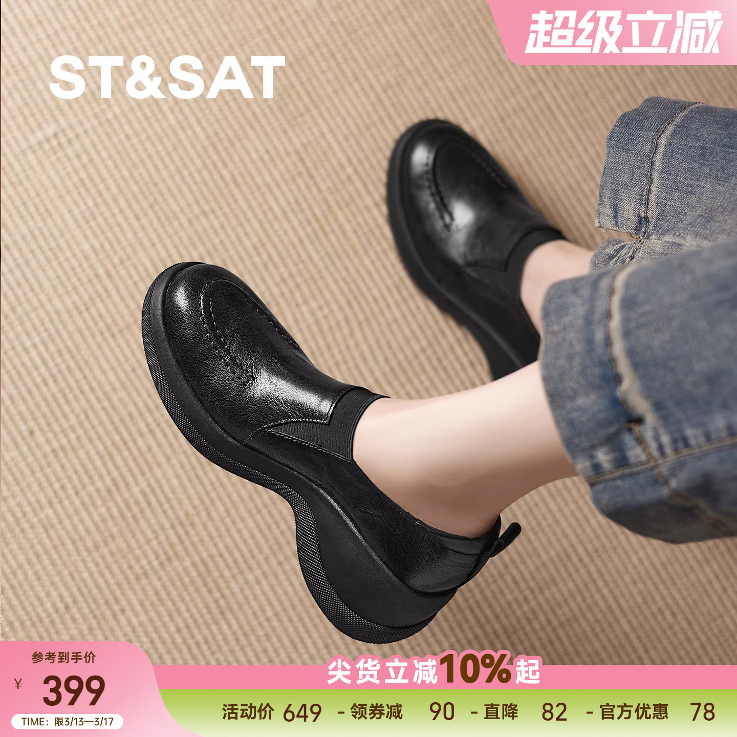星期六真皮厚底乐福鞋女2026春新款黑色坡跟小皮鞋一脚蹬深口单鞋