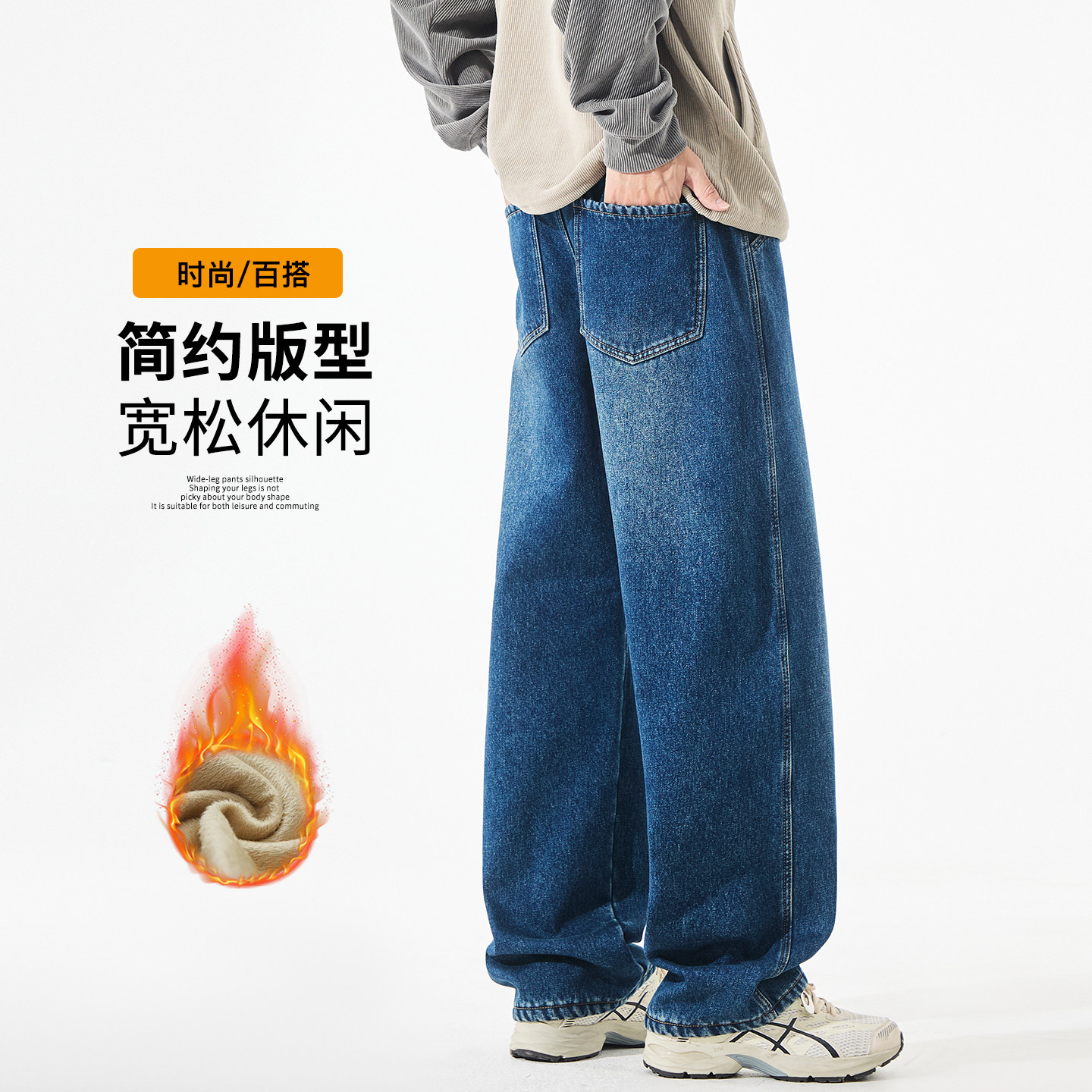 秋冬美式复古加绒牛仔裤男款宽松直筒百搭青少年水洗休闲阔腿裤子