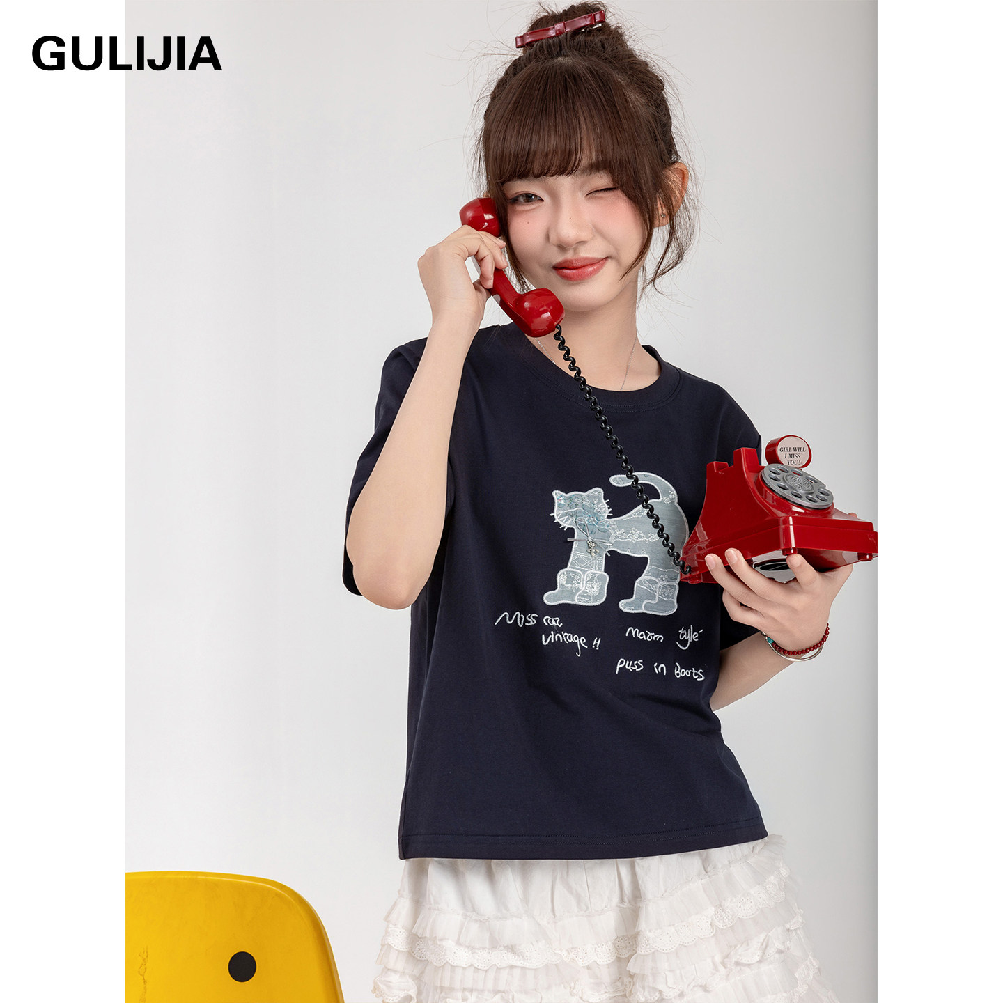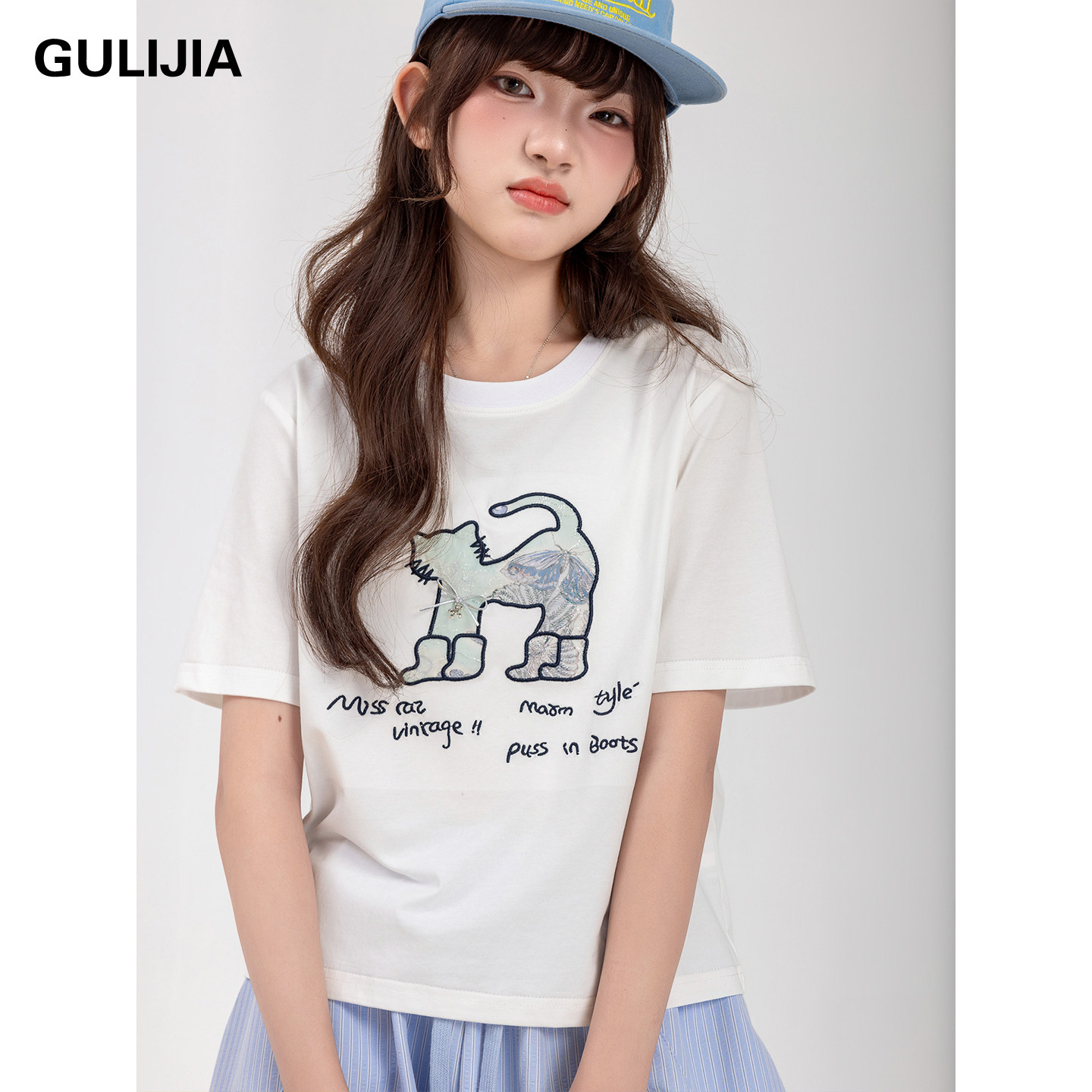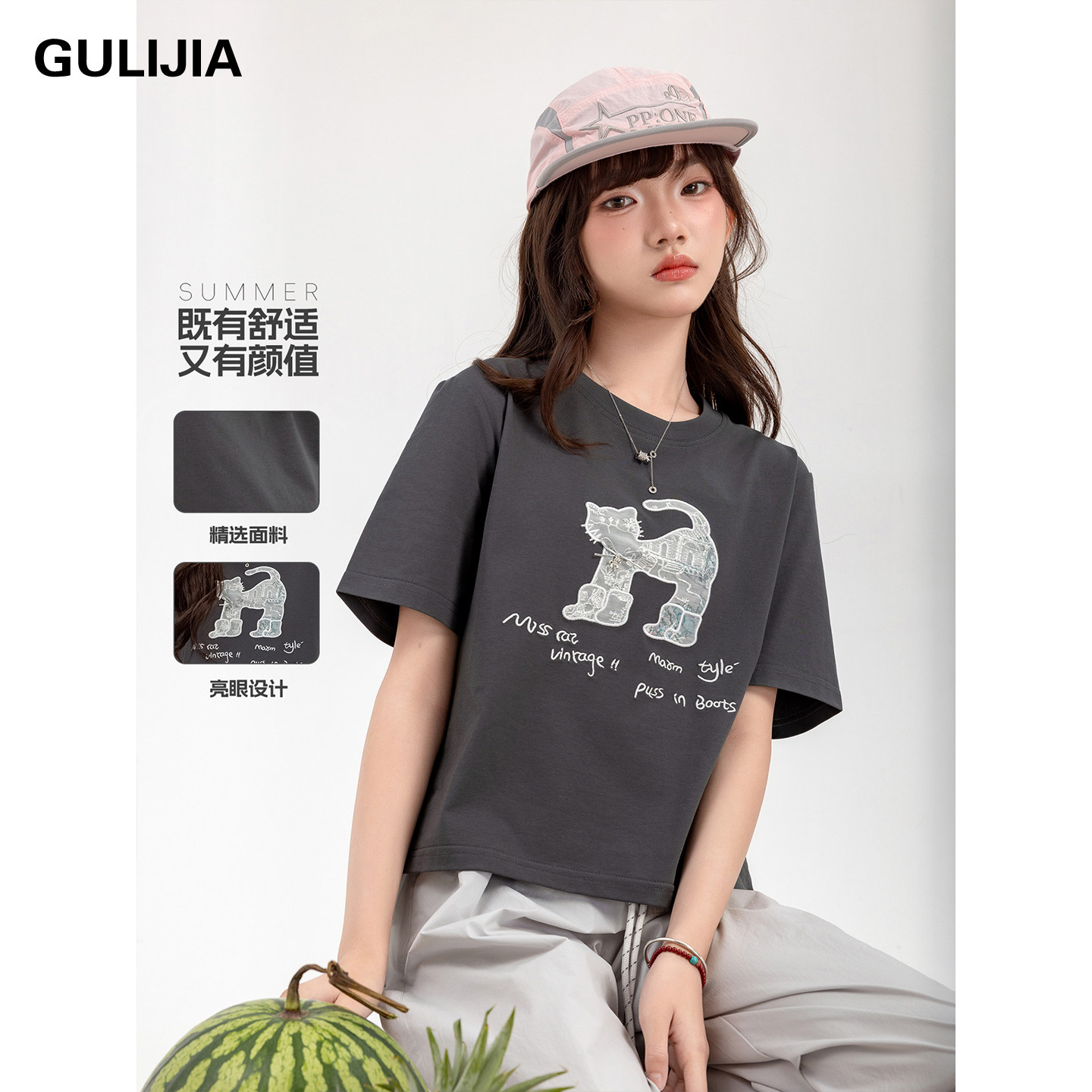 青少年女装夏装猫咪短袖t恤女大童宽松短款上衣初中学生百搭半袖