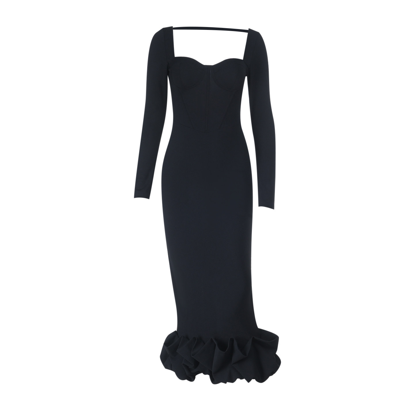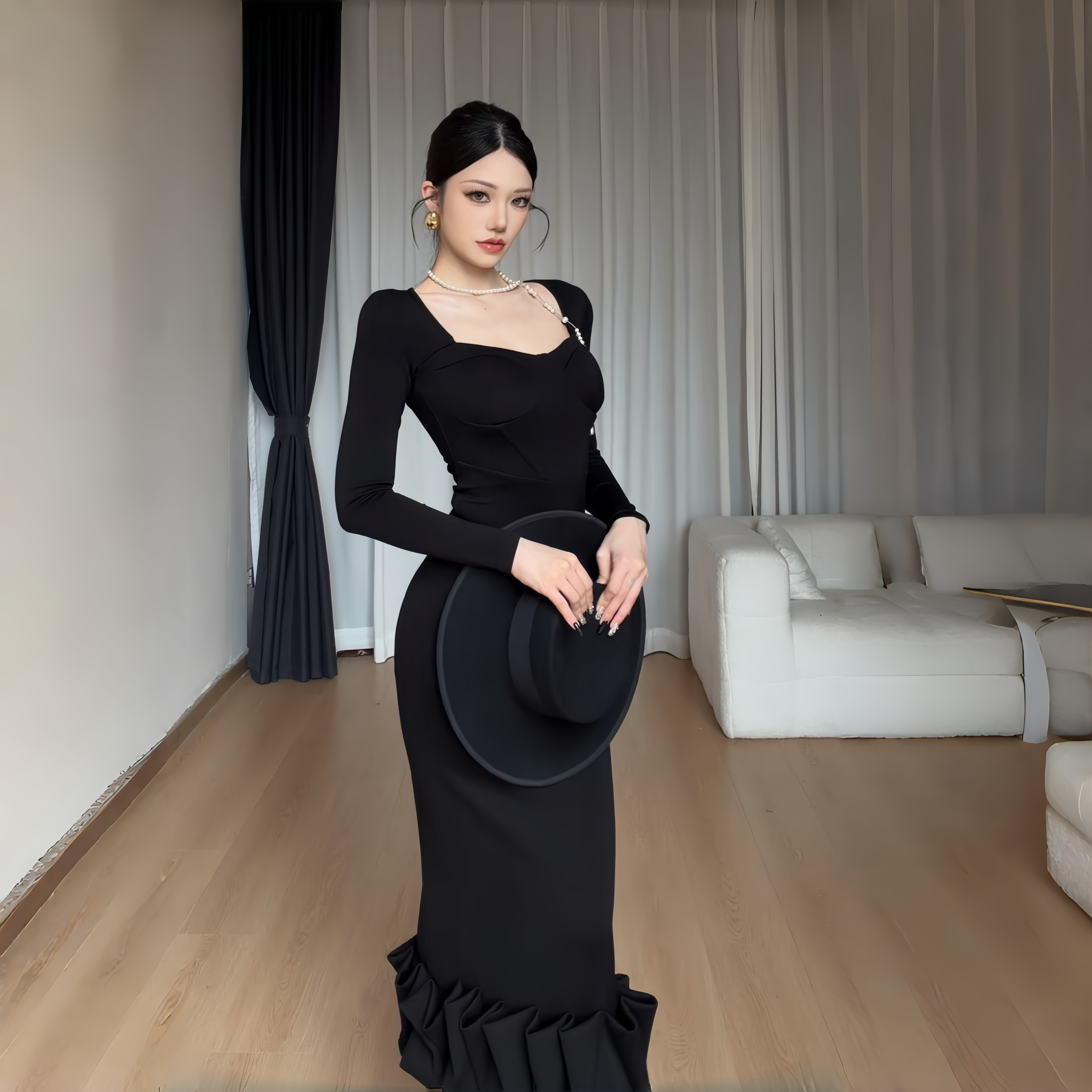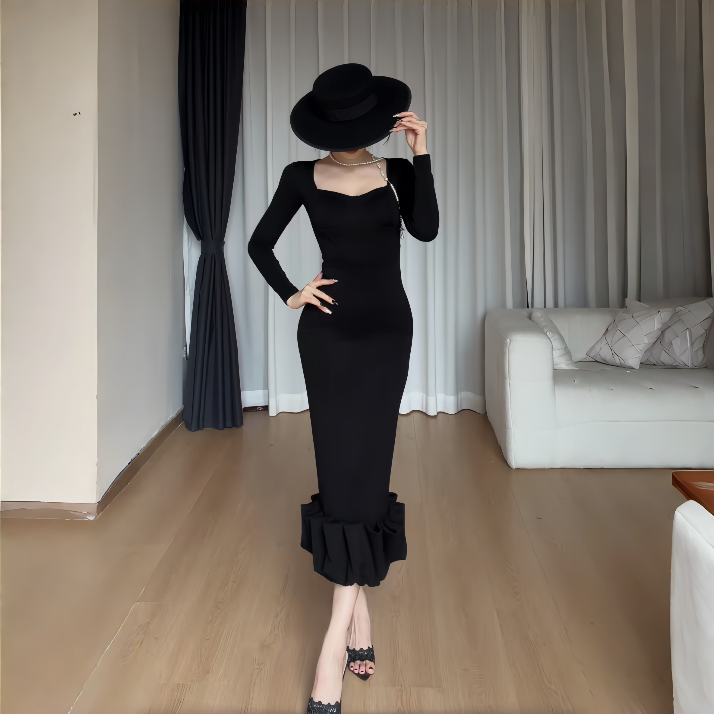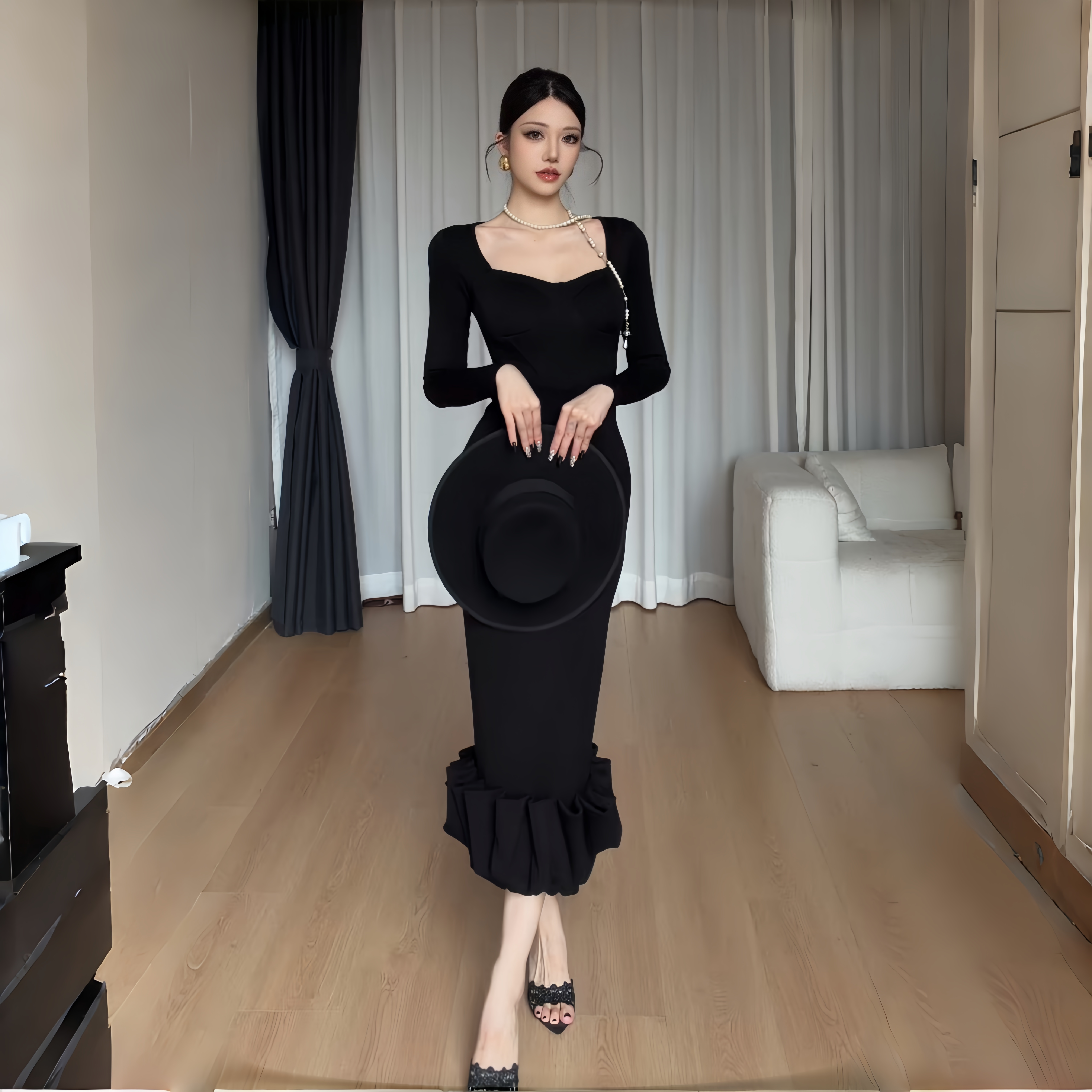 instunning法式气质赫本风方领包臀裙女秋冬修身黑色长袖连衣裙子