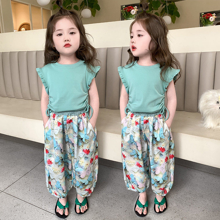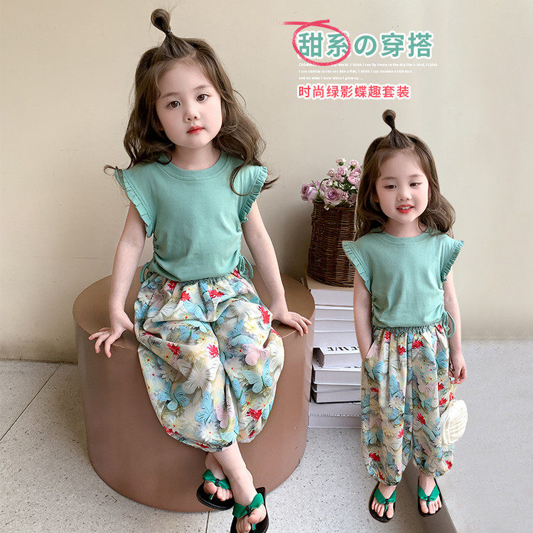 女童夏季韩版两件套飞袖上衣印花裤子薄款套装夏日可爱风