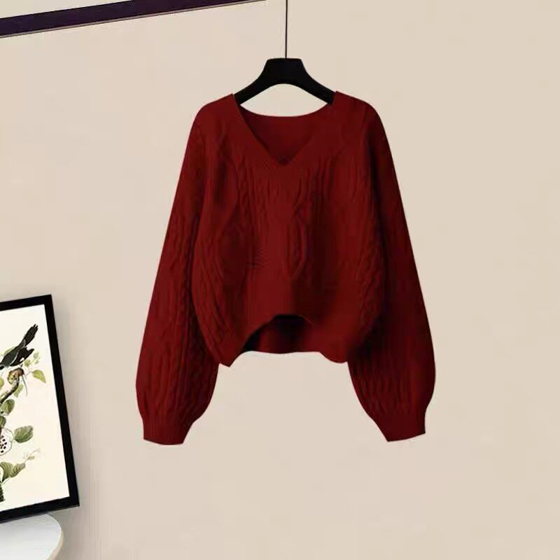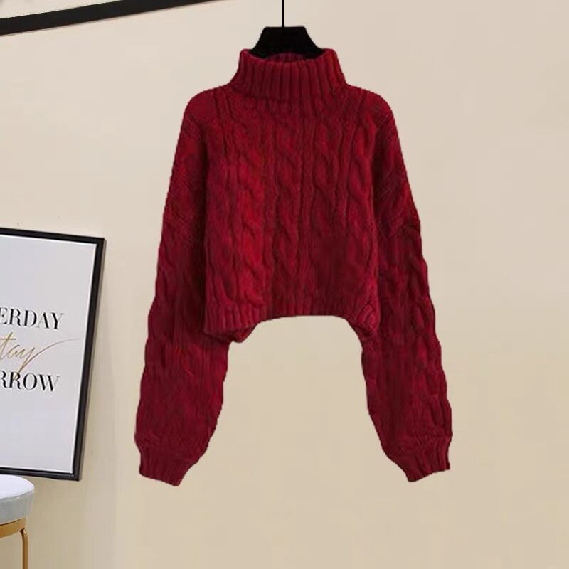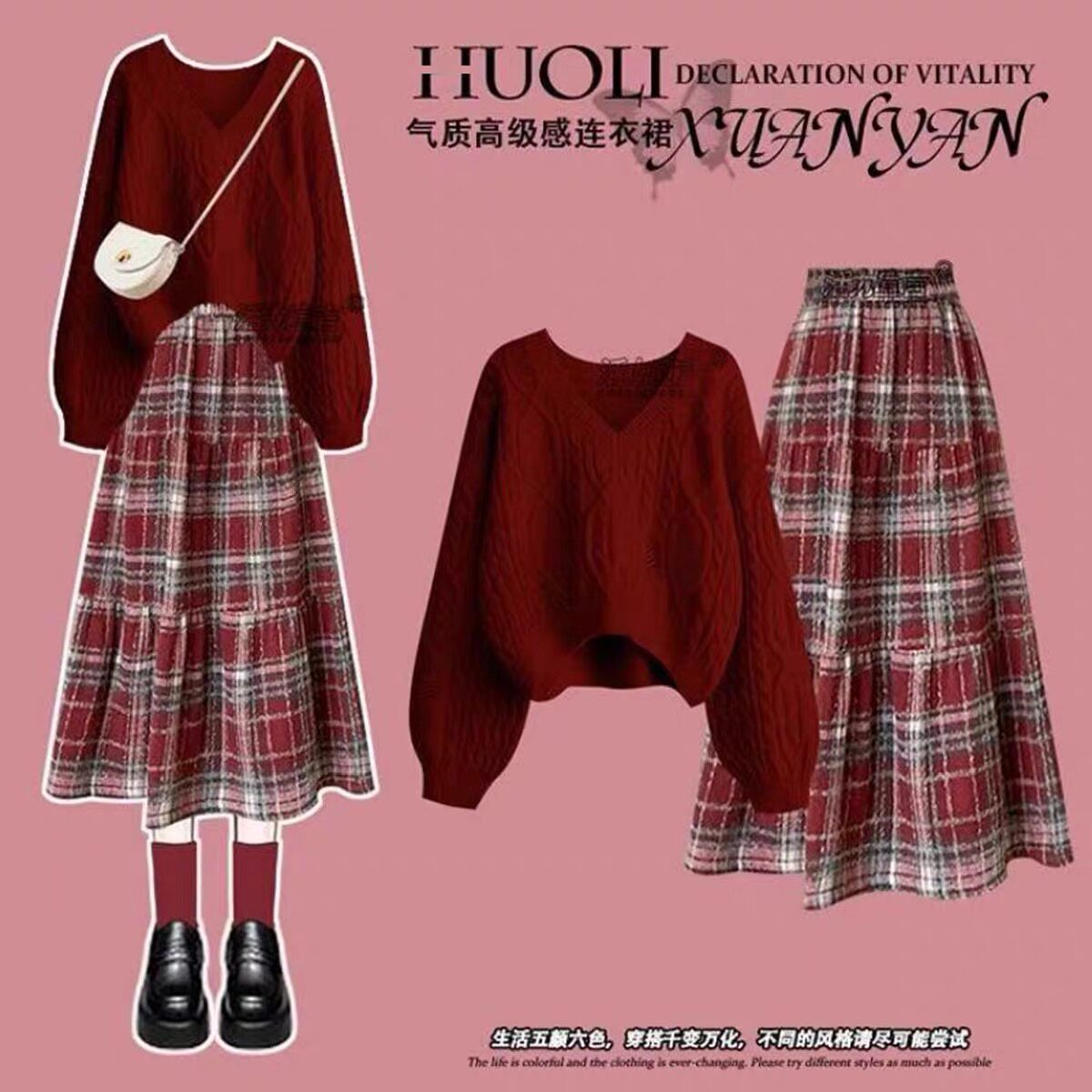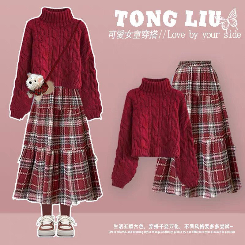 女童马年套装2026秋季新年红色毛衣格子毛呢长裙大童半身裙两件套