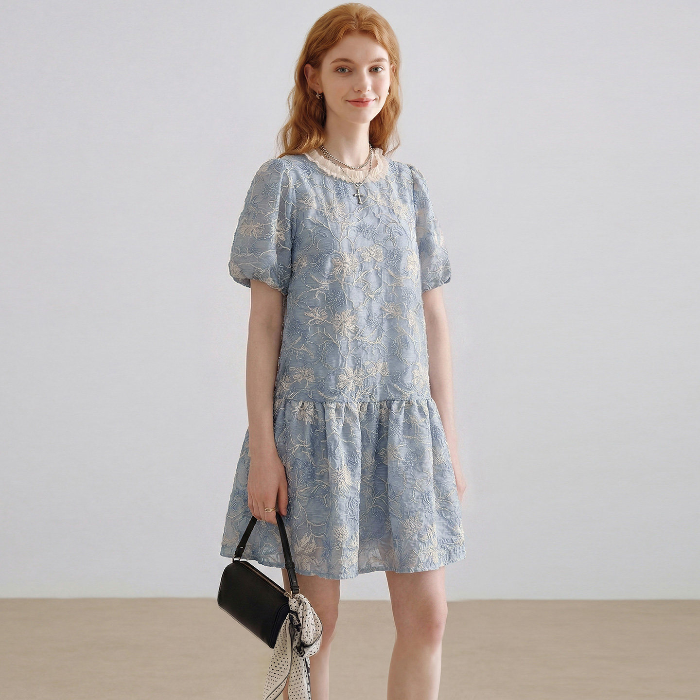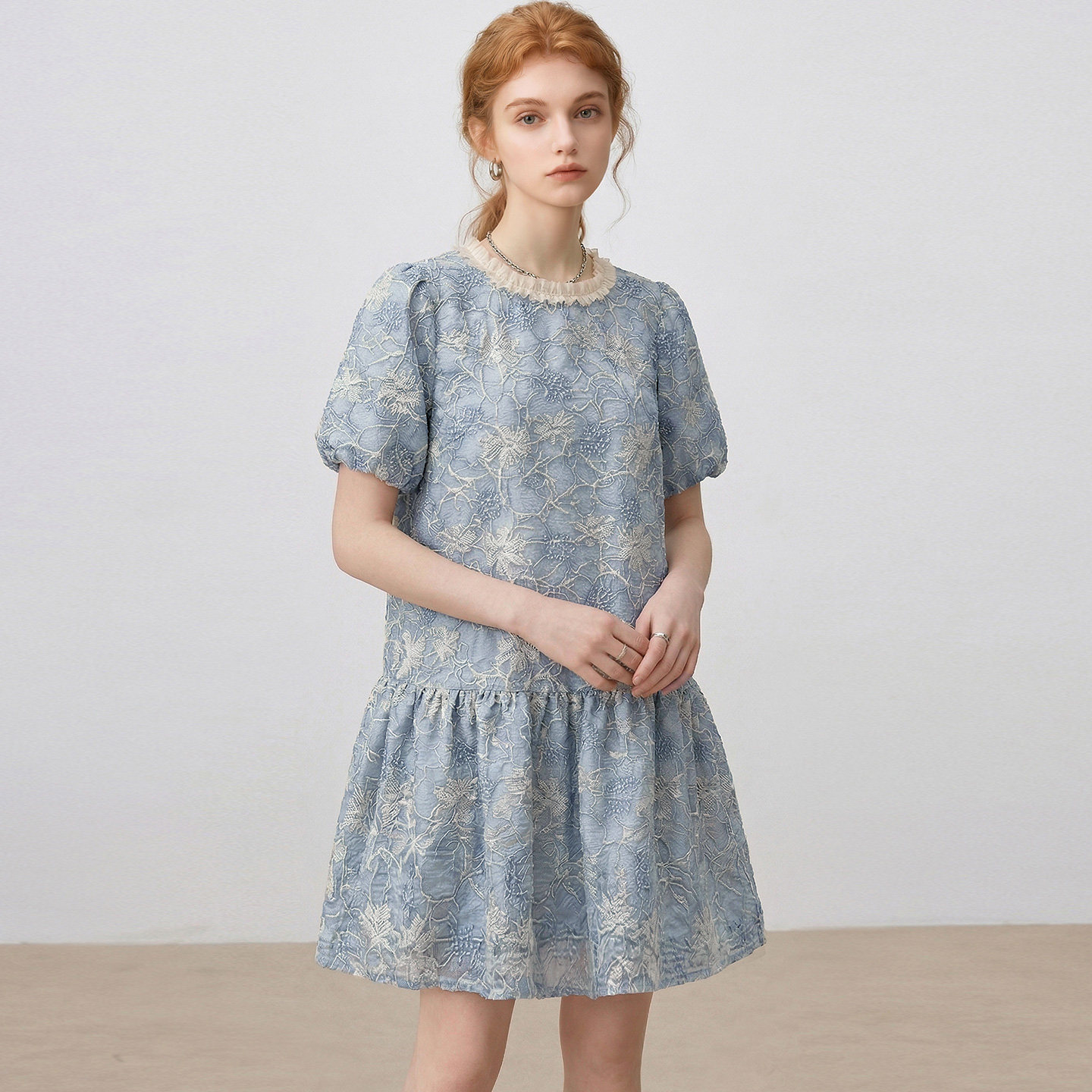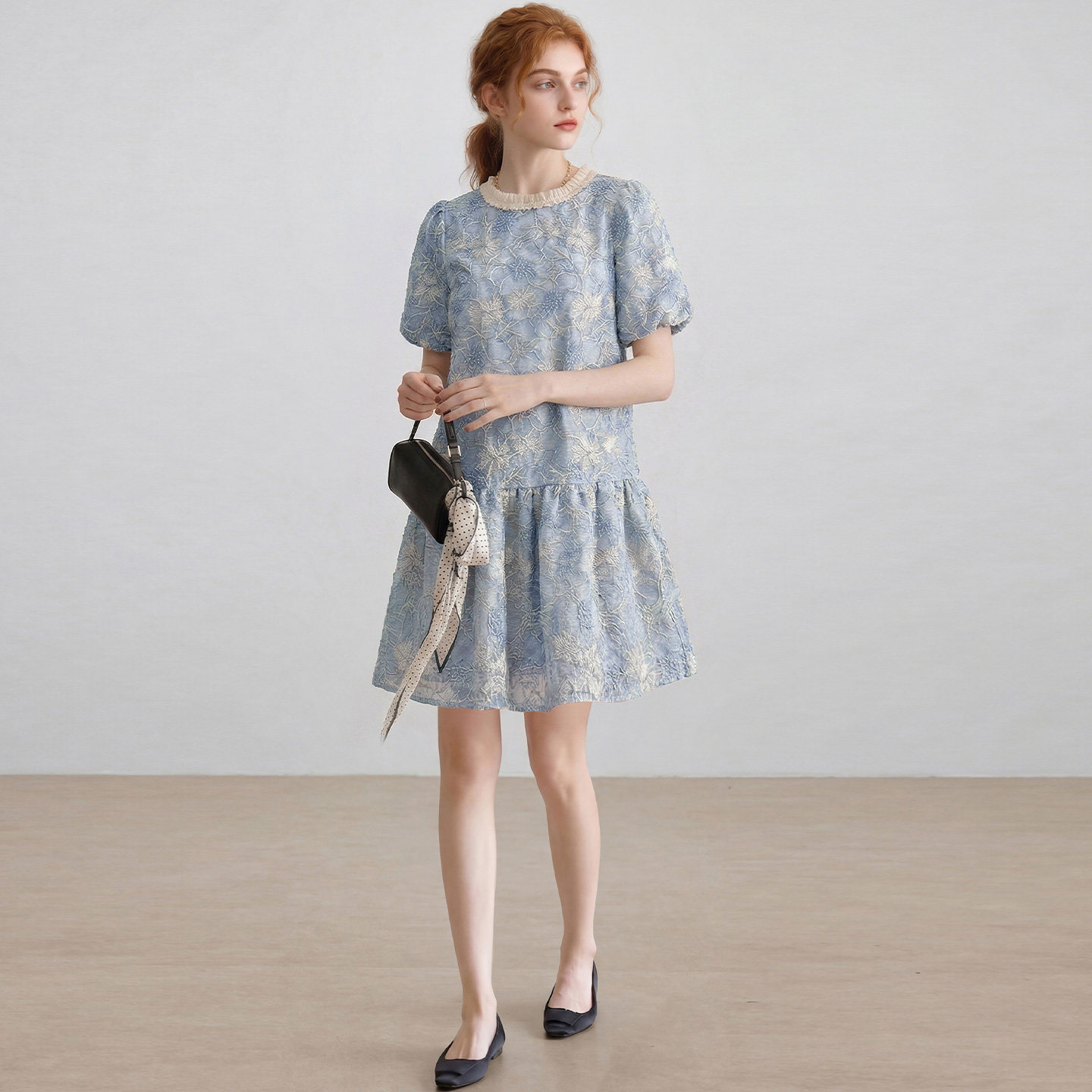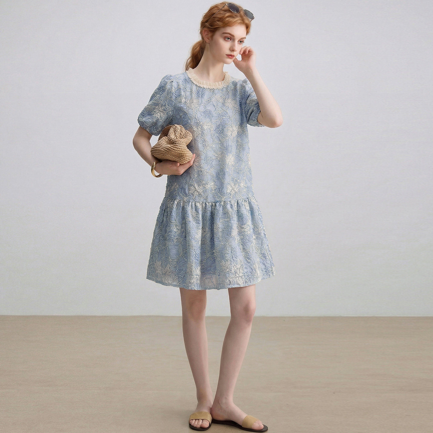 dfvc法式泡泡袖绣花连衣裙女2026年夏季新款宽松减龄小个子中长裙