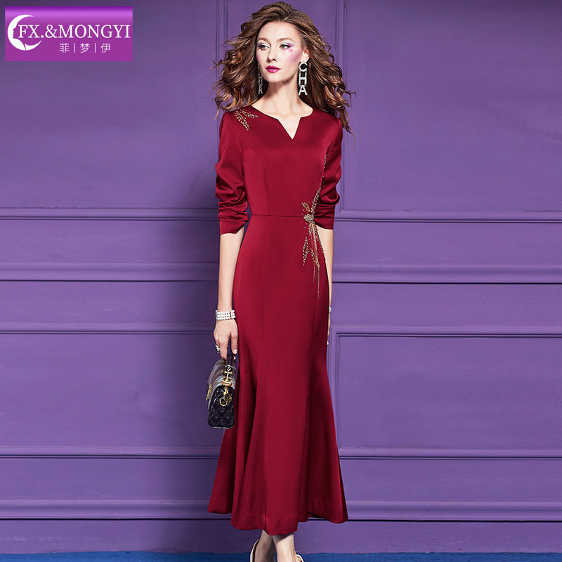 菲梦伊原创钉珠红色连衣裙女长袖秋装高端气质时尚V领妈妈晚礼服