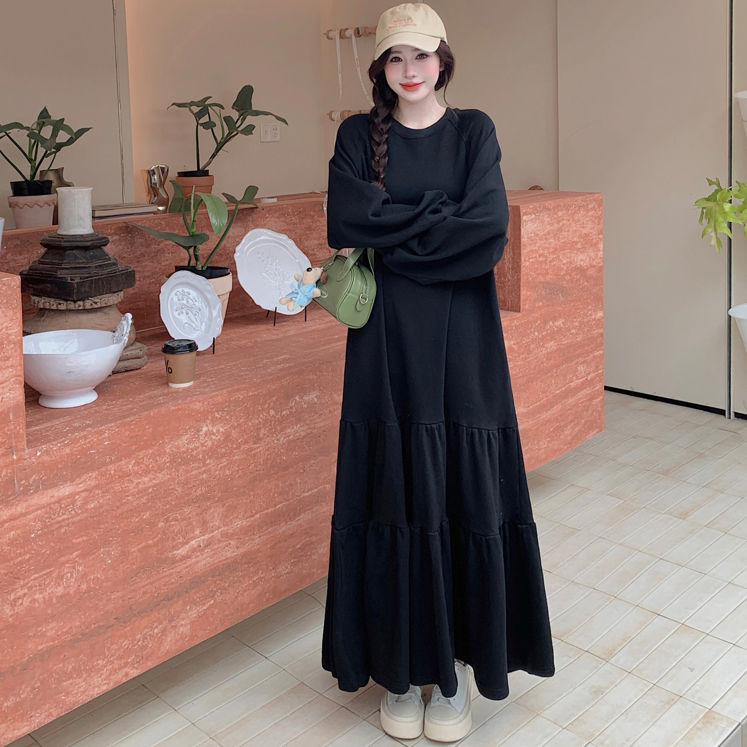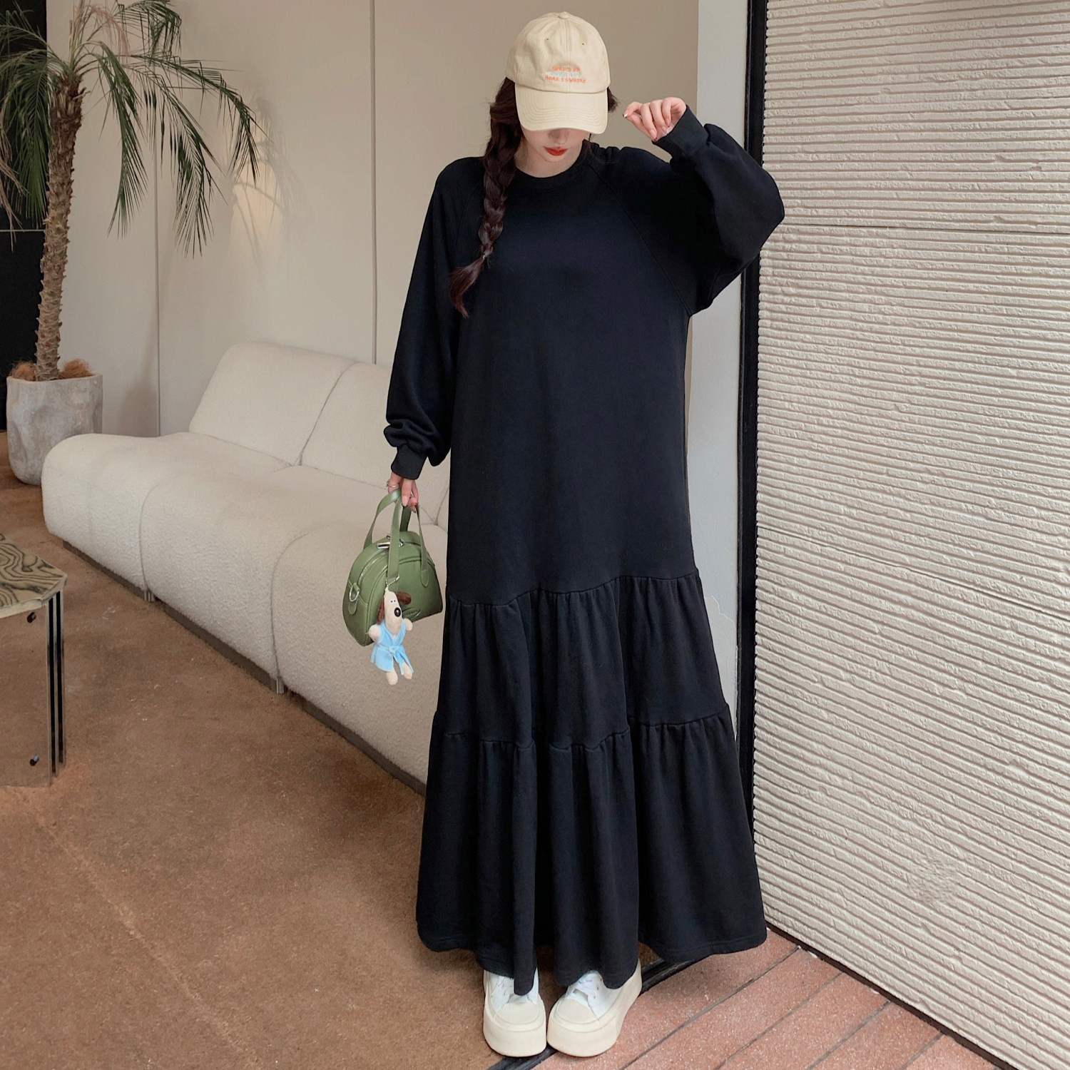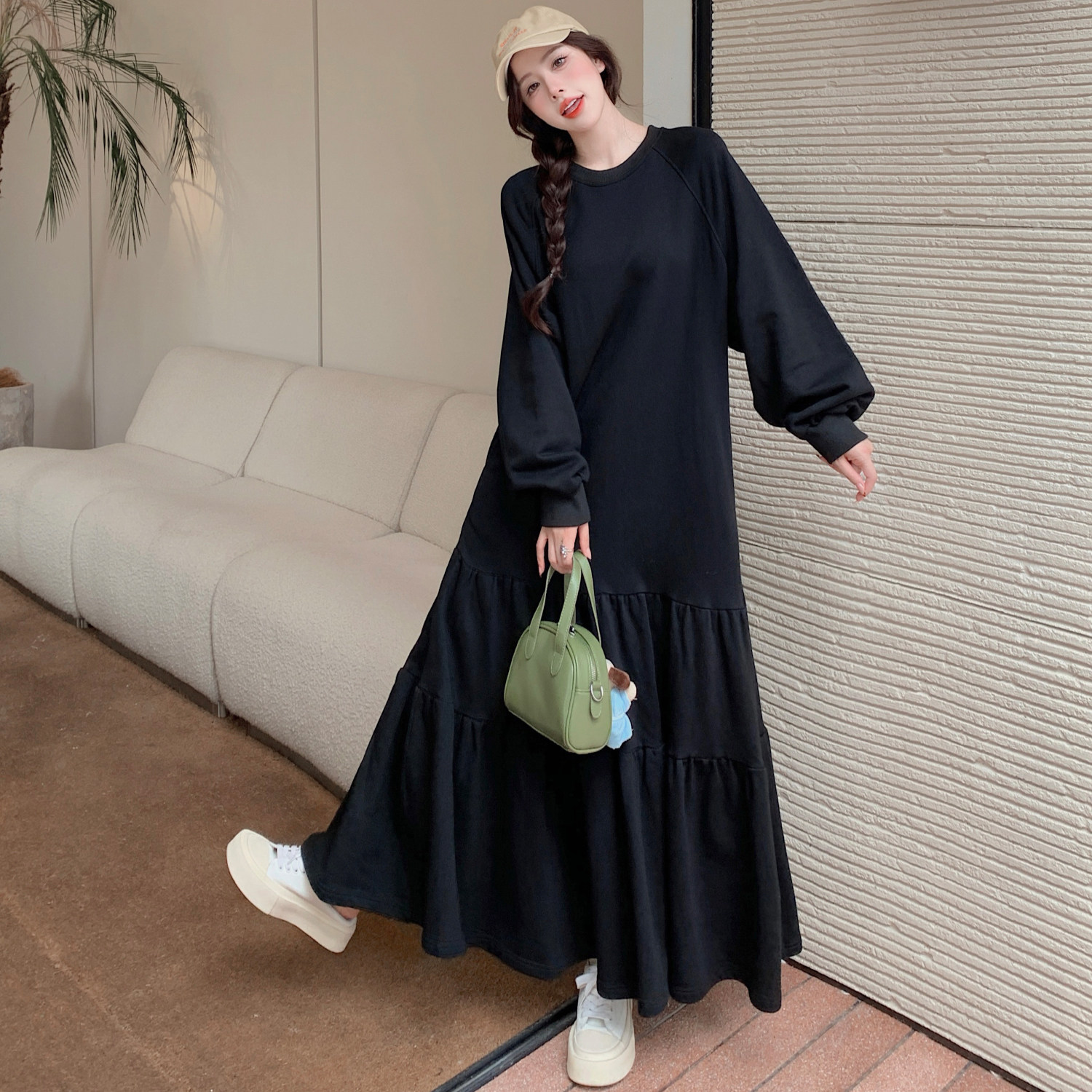 春秋季新款大码女装胖mm宽松显瘦遮肚法式拼接连衣裙过膝打底长裙