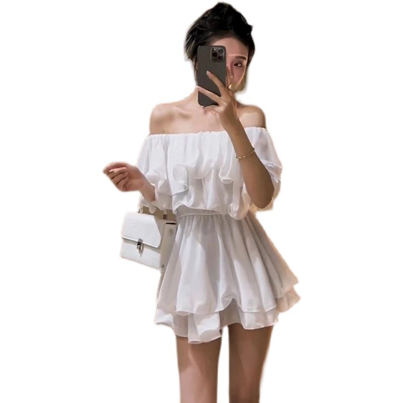 2025夏季新款甜美荷叶边一字肩性感收腰显瘦藏肉短款雪纺连衣裙女