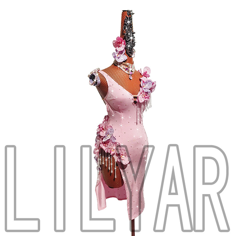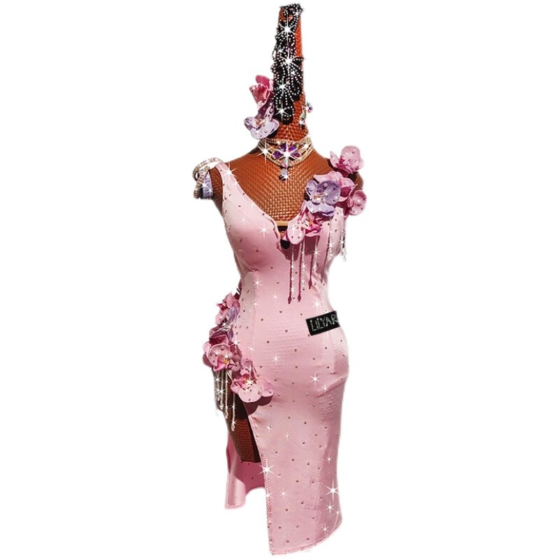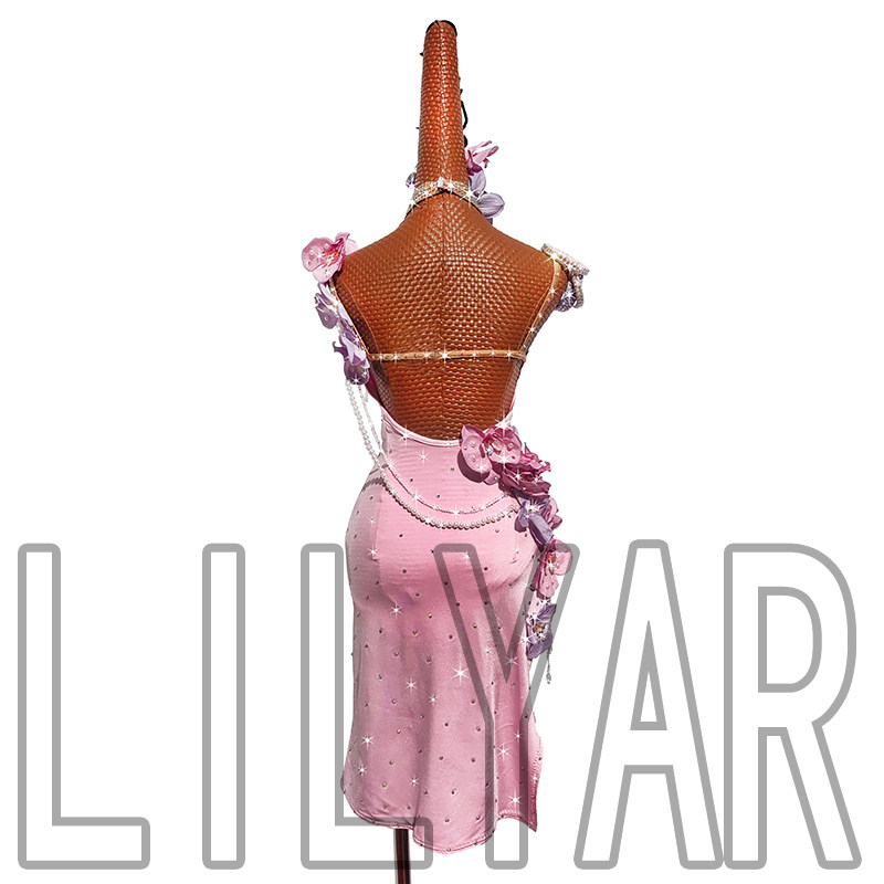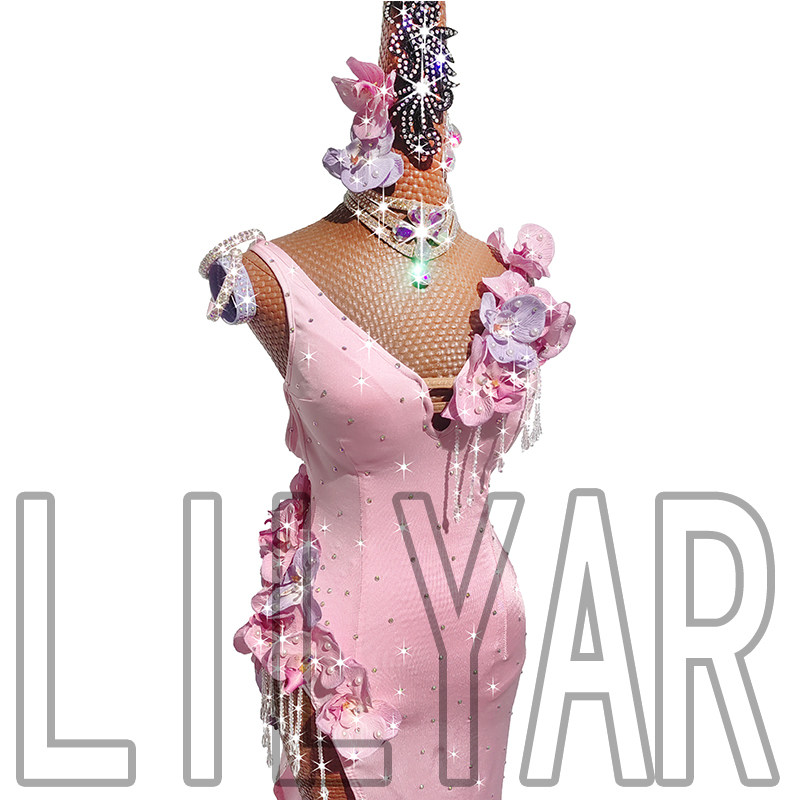 新款拉丁舞比赛演出表演成人少女粉色立体花珍珠闪钻舞裙