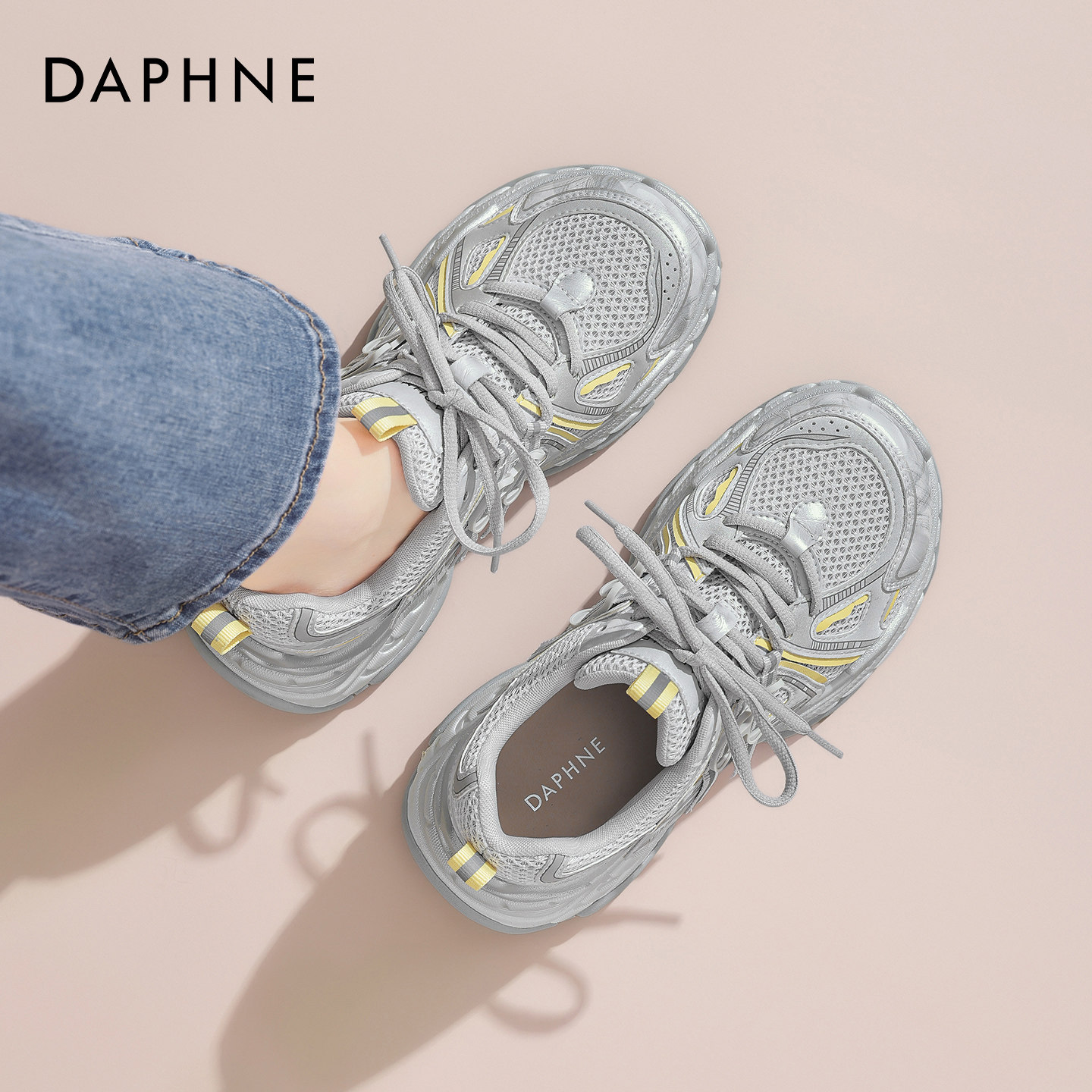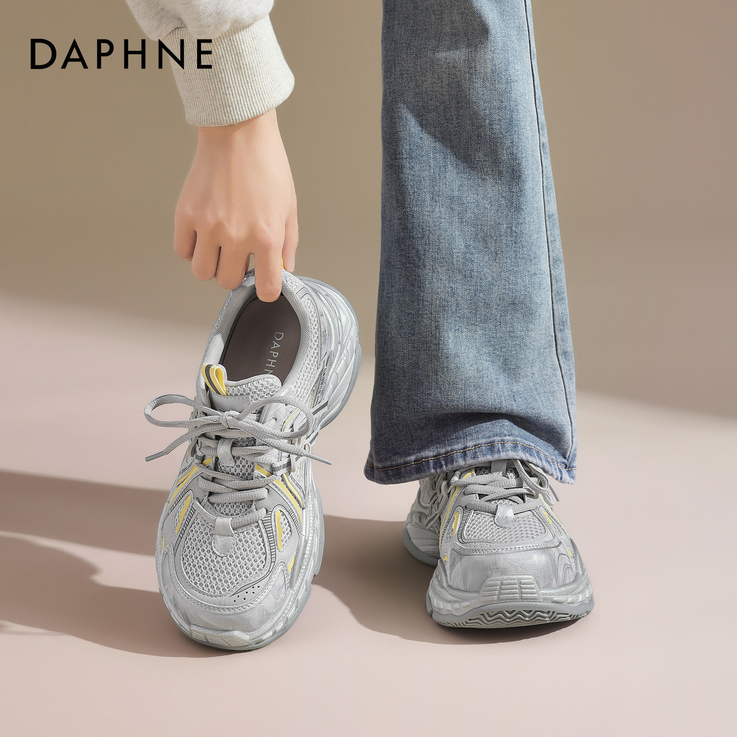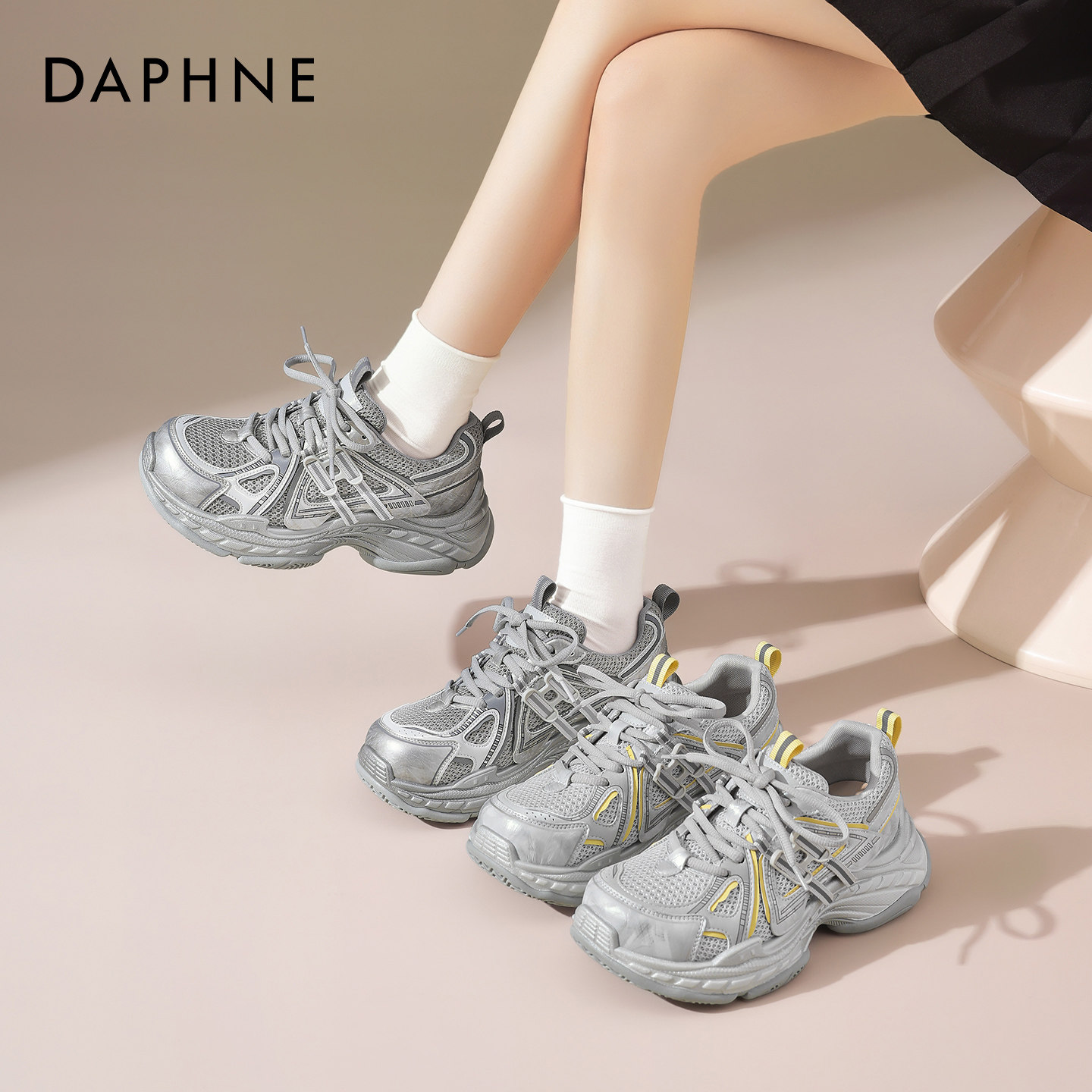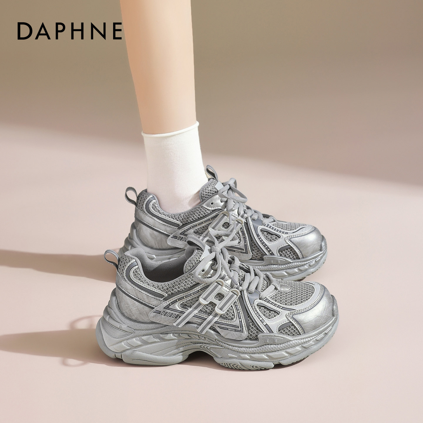 达芙妮银色增高老爹鞋女款2026春夏新款运动休闲鞋透气网鞋显脚小