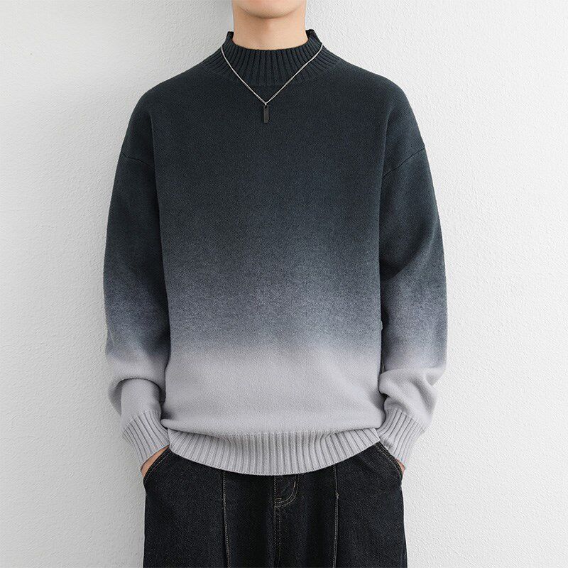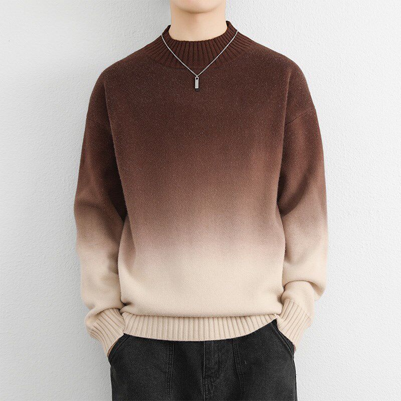 半高领毛衣男款冬季加绒加厚保暖衣时尚渐变毛线衣红色宽松打底衫