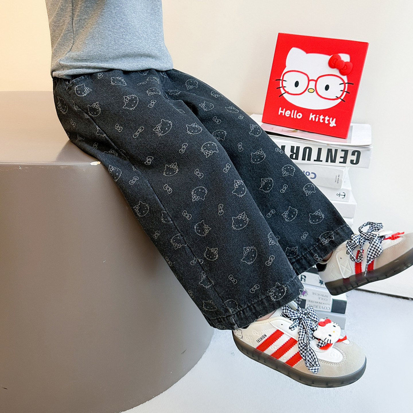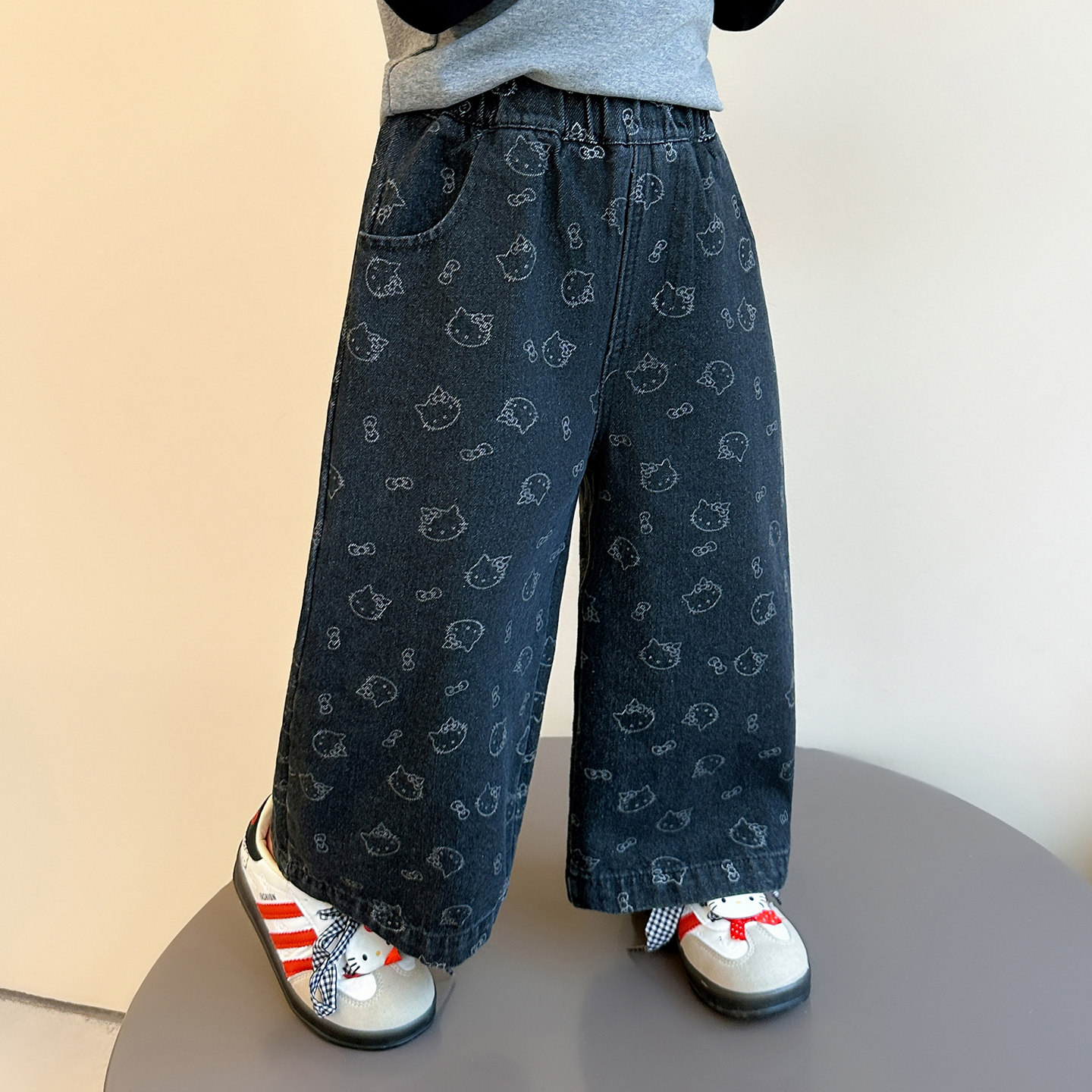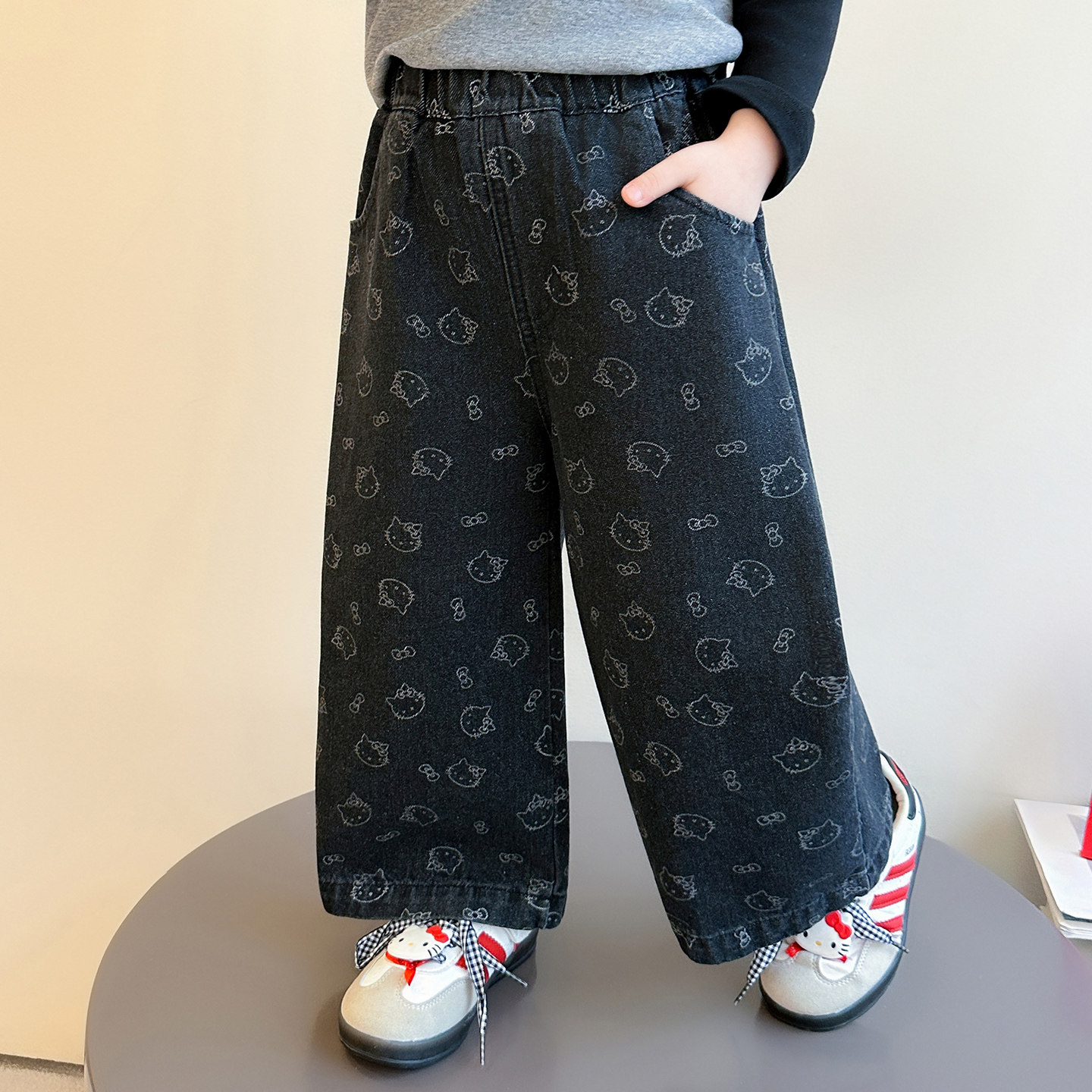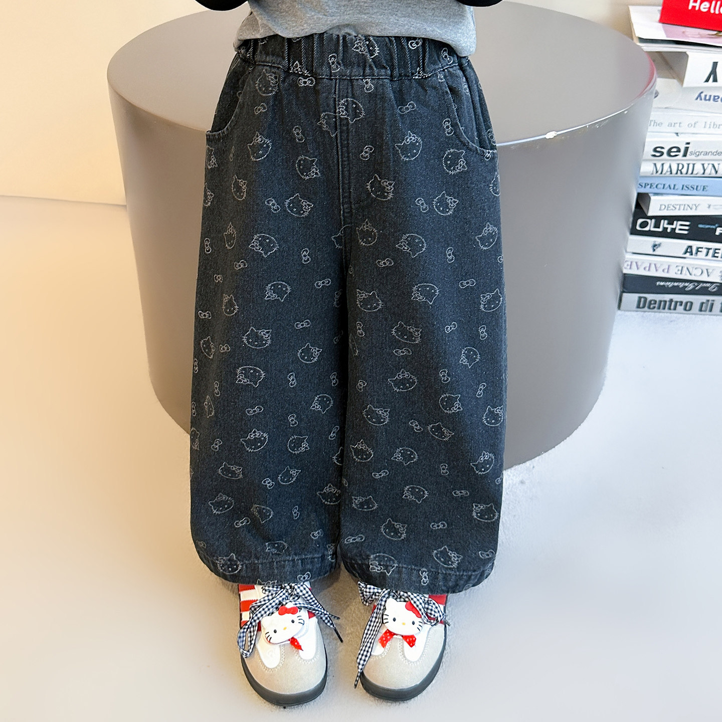 女童牛仔裤春秋款2026新款儿童春季女宝宝猫咪春装直筒裤阔腿裤子