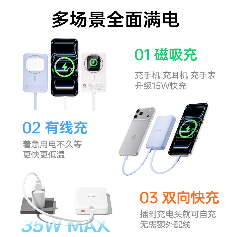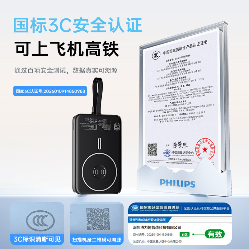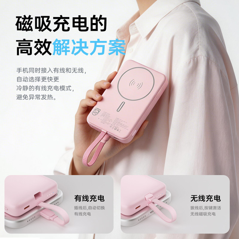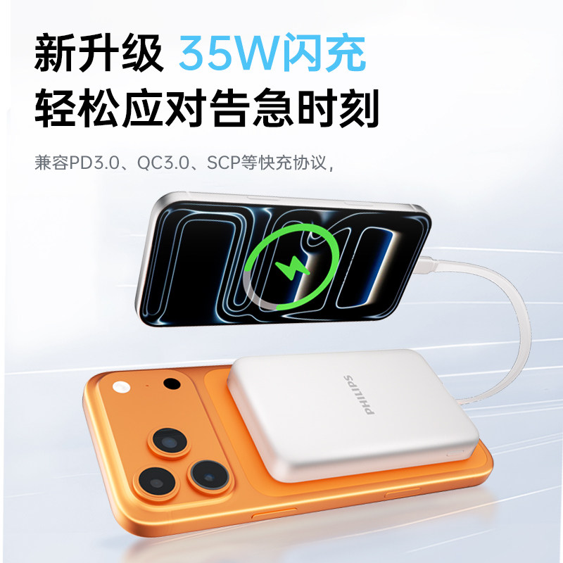 飞利浦磁吸无线充电宝2026新款自带线3C认证可上飞机10000毫安大容量35W快充小巧便携移动电源适用苹果17定制