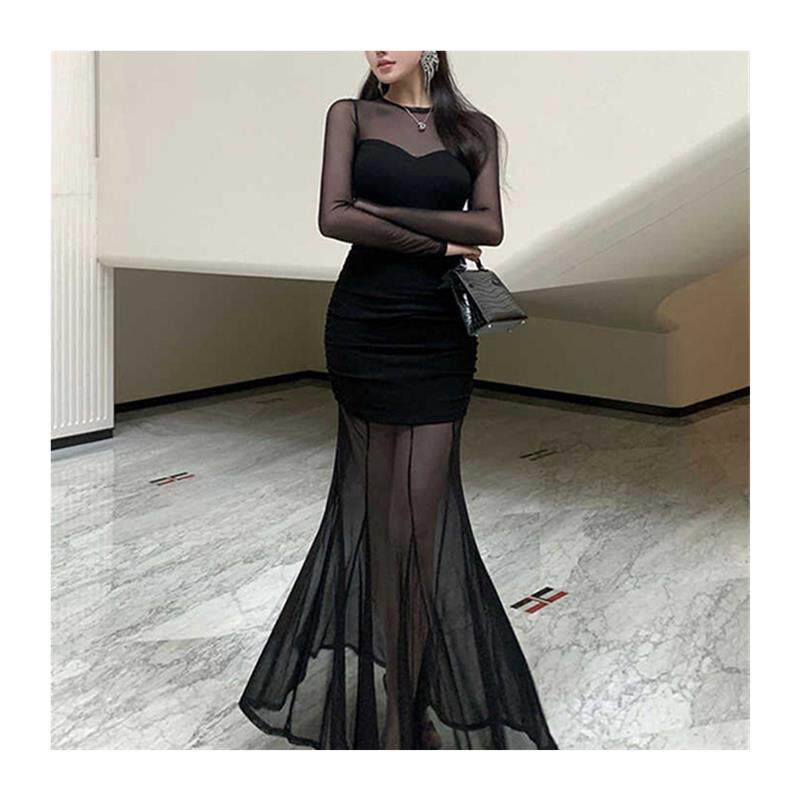 御姐风网纱拼接长袖连衣裙女装早春性感修身显瘦黑色包臀长款裙子