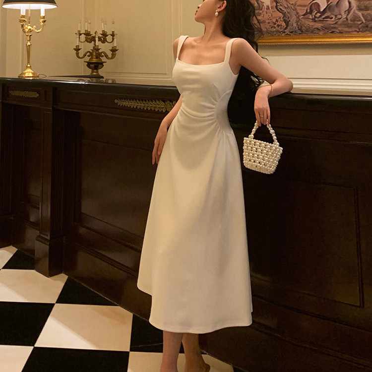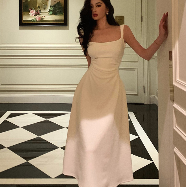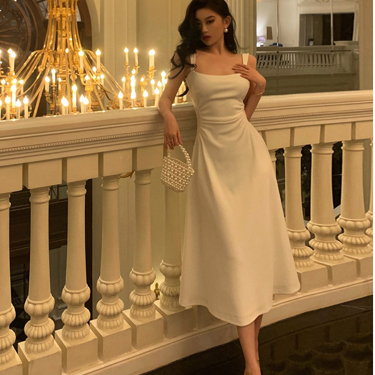 法式白色吊带连衣裙女2025新款收腰裙子高级感领证礼服长裙小个子