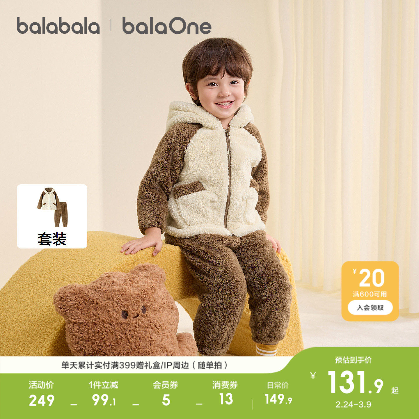 巴拉巴拉童装儿童珊瑚绒套装冬季加厚保暖宝宝睡衣萌男女童家居服