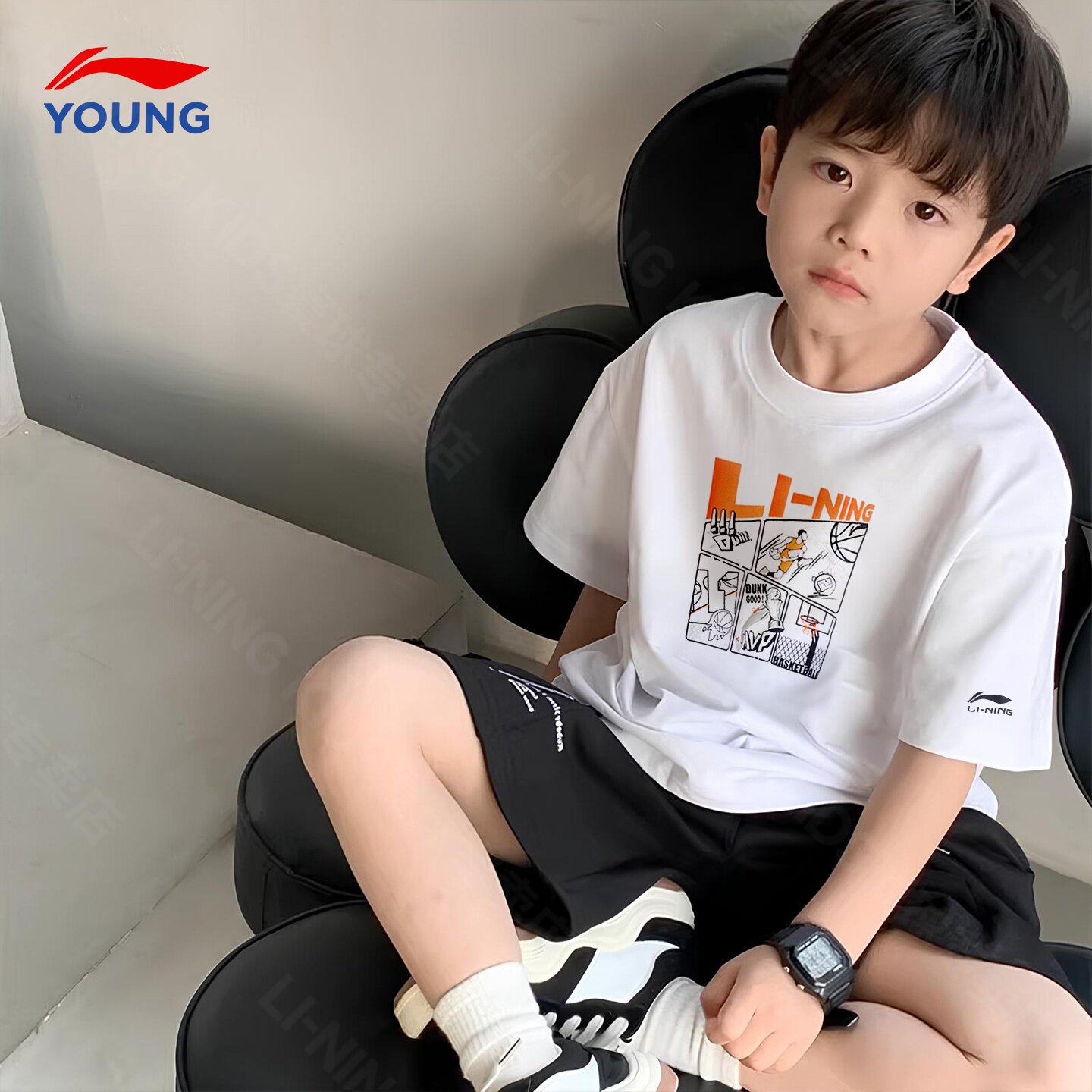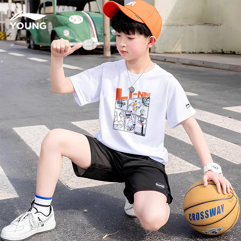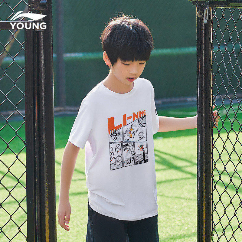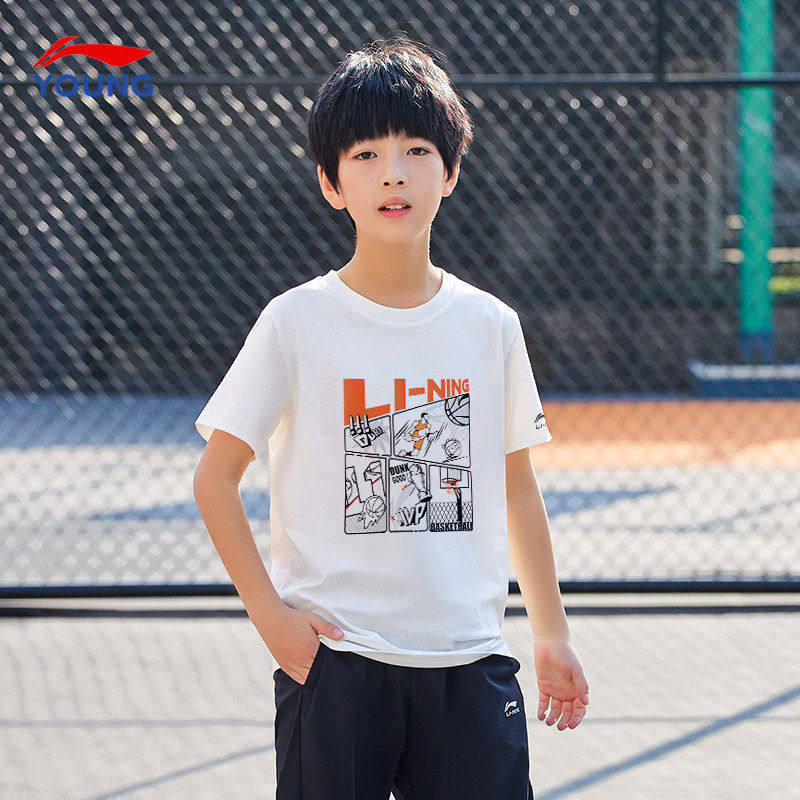 李宁儿童短袖男童t恤2026夏季新款大童时尚纯棉透气吸汗白色半袖