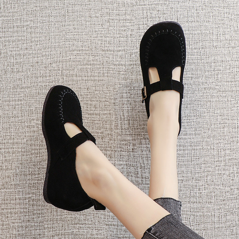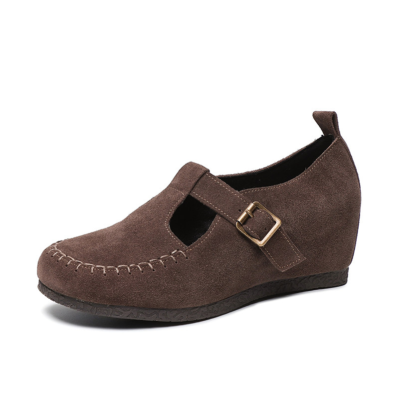 内增高女鞋2026新款软底文艺复古一字带坡跟单鞋磨砂真皮休闲鞋子