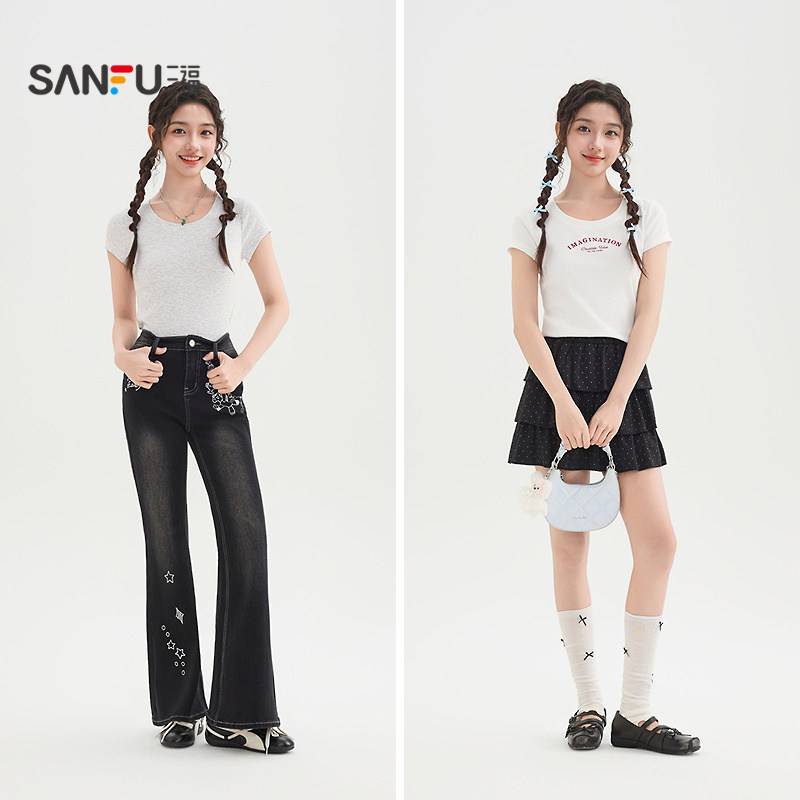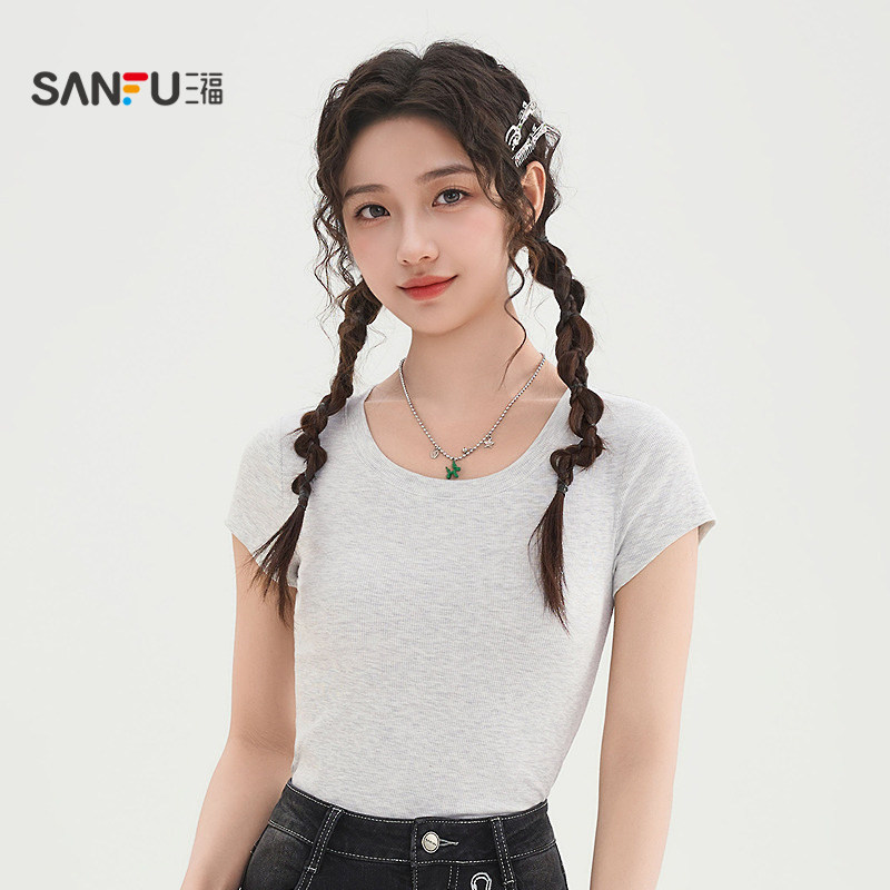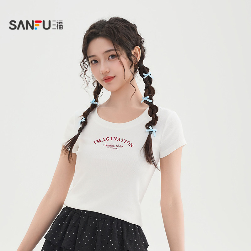 三福白色短袖2026新款夏季小个子英文印花圆领休闲上衣女装519300