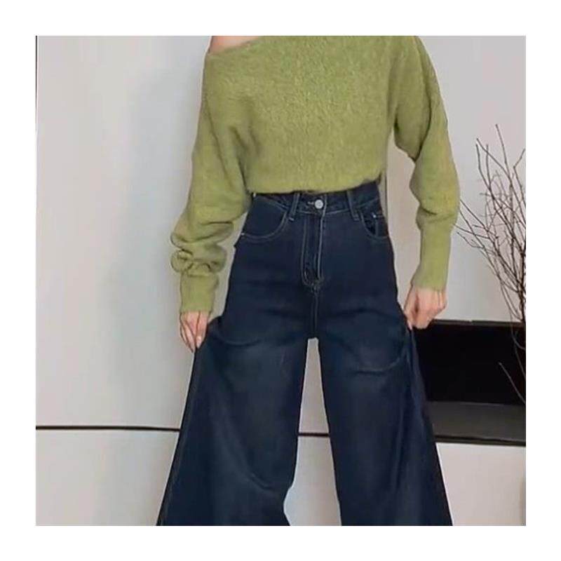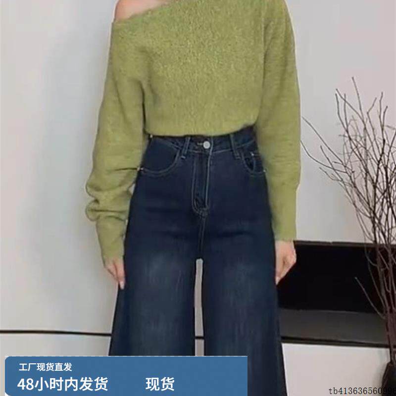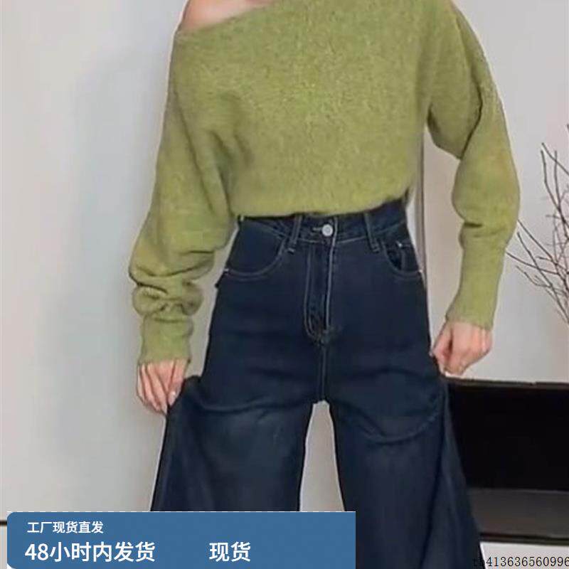 绿色气质设计感斜肩长袖小衫2025秋冬新款修身小众高级感上衣女款