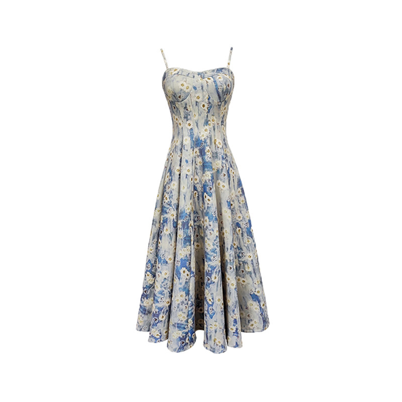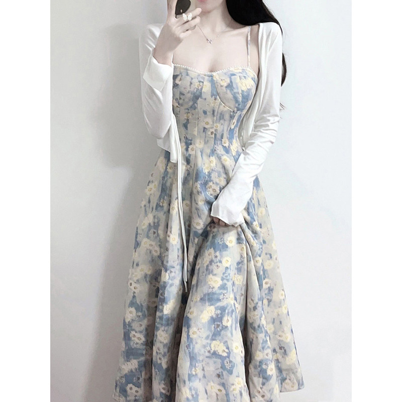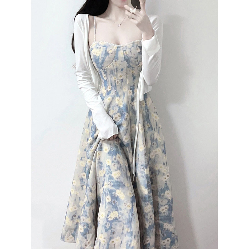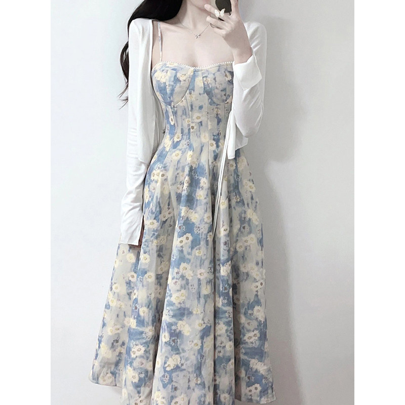法式海边度假蓝色碎花吊带连衣裙长裙春夏2026新款开衫裙子两件套