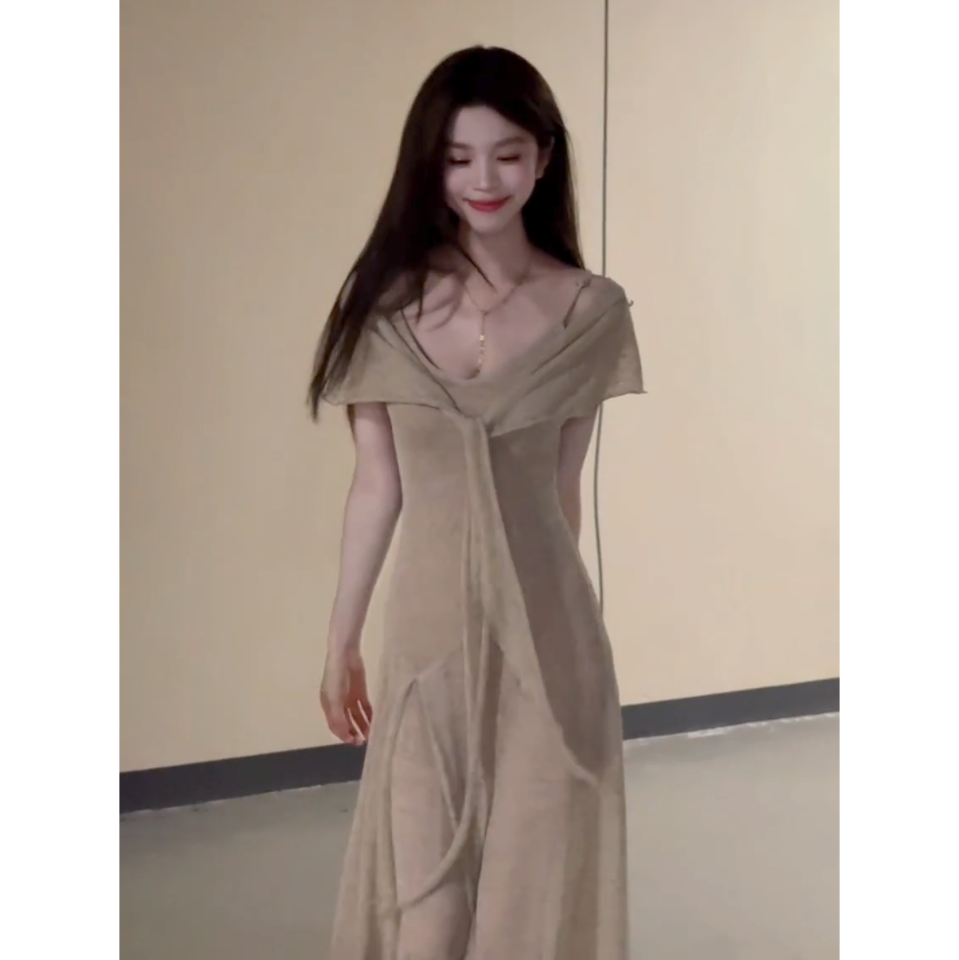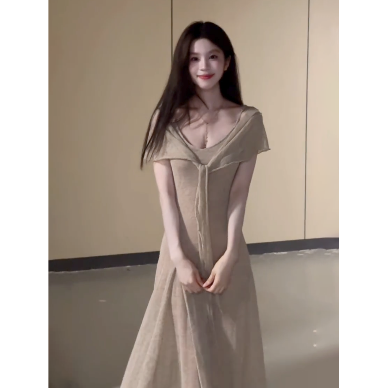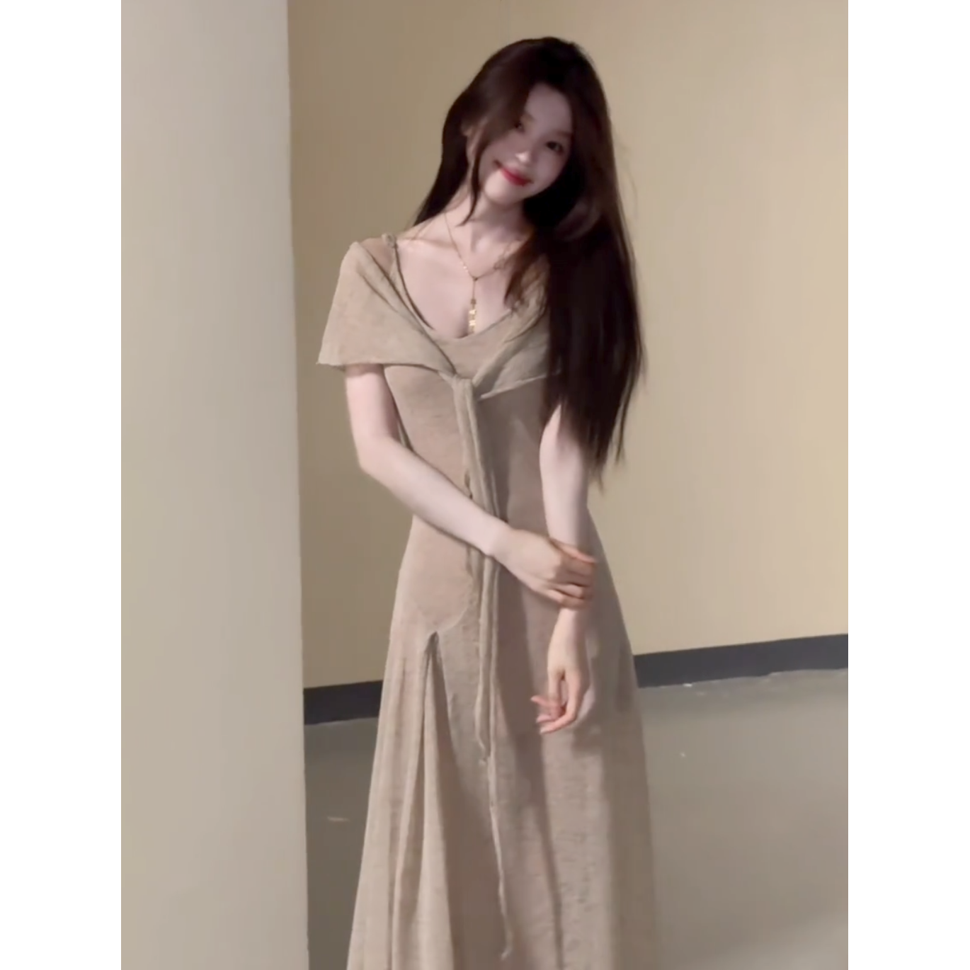 夏季温柔慵懒燕麦色薄款针织长裙通勤百搭日常吊带连衣裙披肩套装