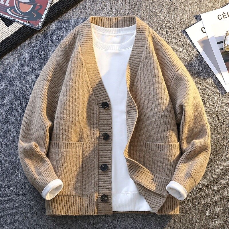 纯色V领毛衣外套男春秋季潮牌青少年简约休闲宽松百搭针织开衫
