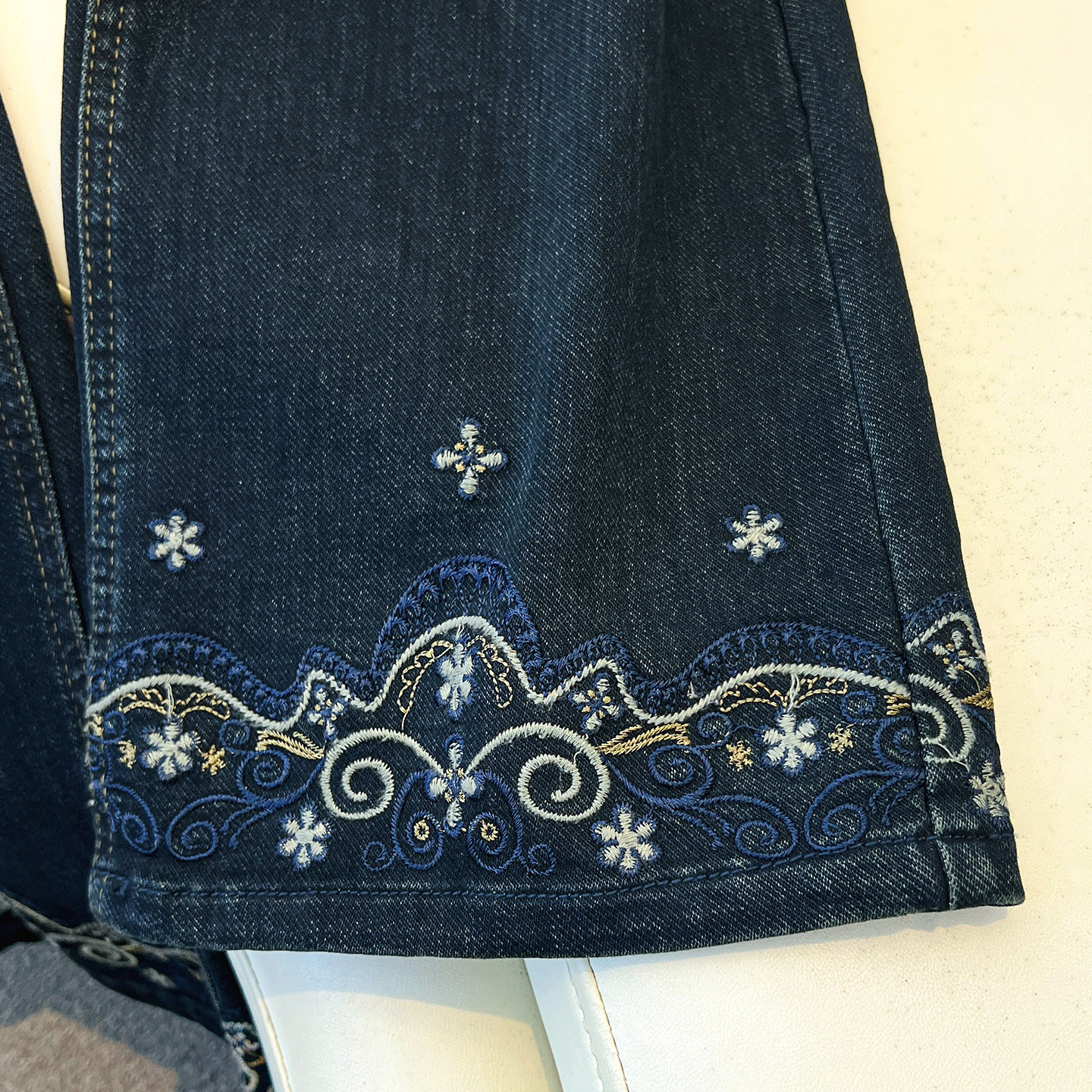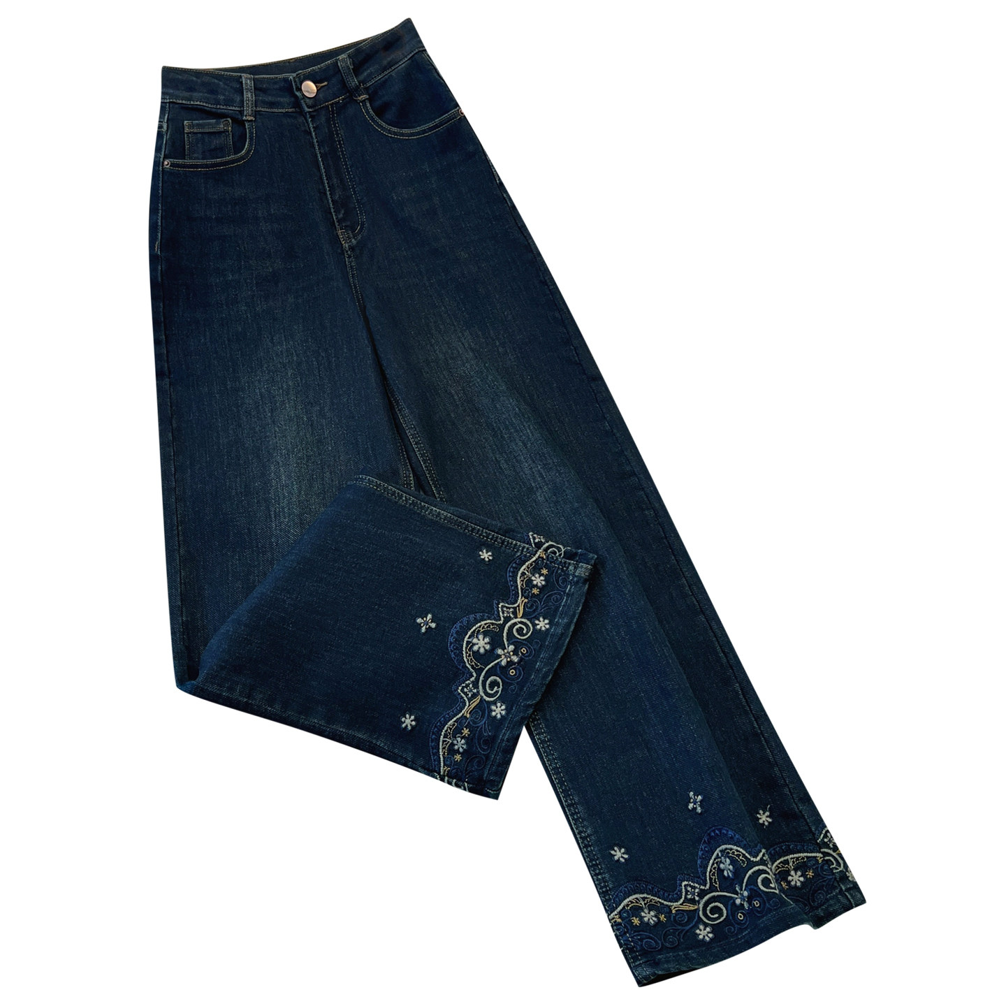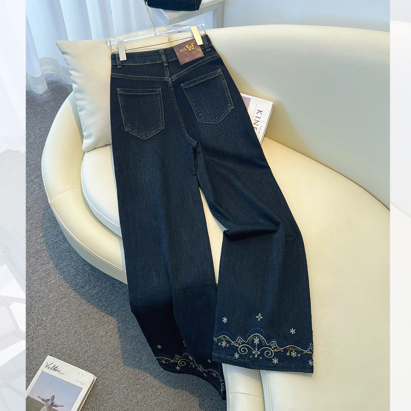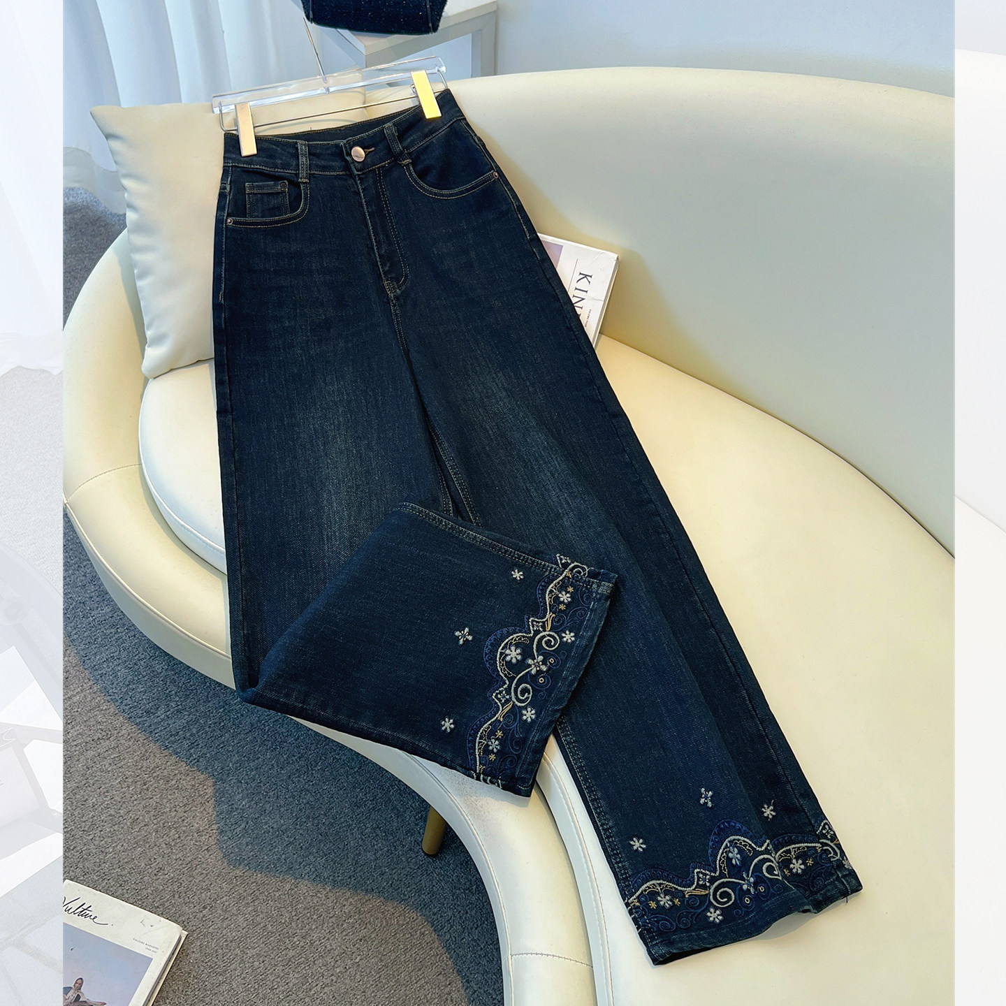 今年流行爆款深蓝色高腰刺绣阔腿牛仔裤女2026春季新款宽松直筒裤