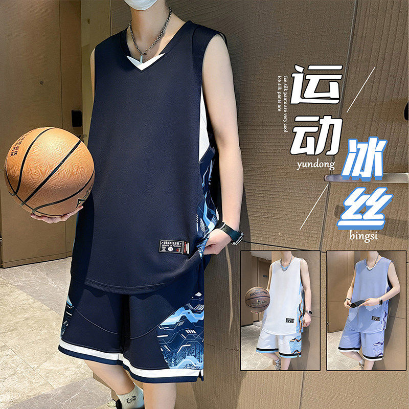 红色冰丝运动套装篮球服夏季宽松速干无袖T恤背心短裤跑步训练服